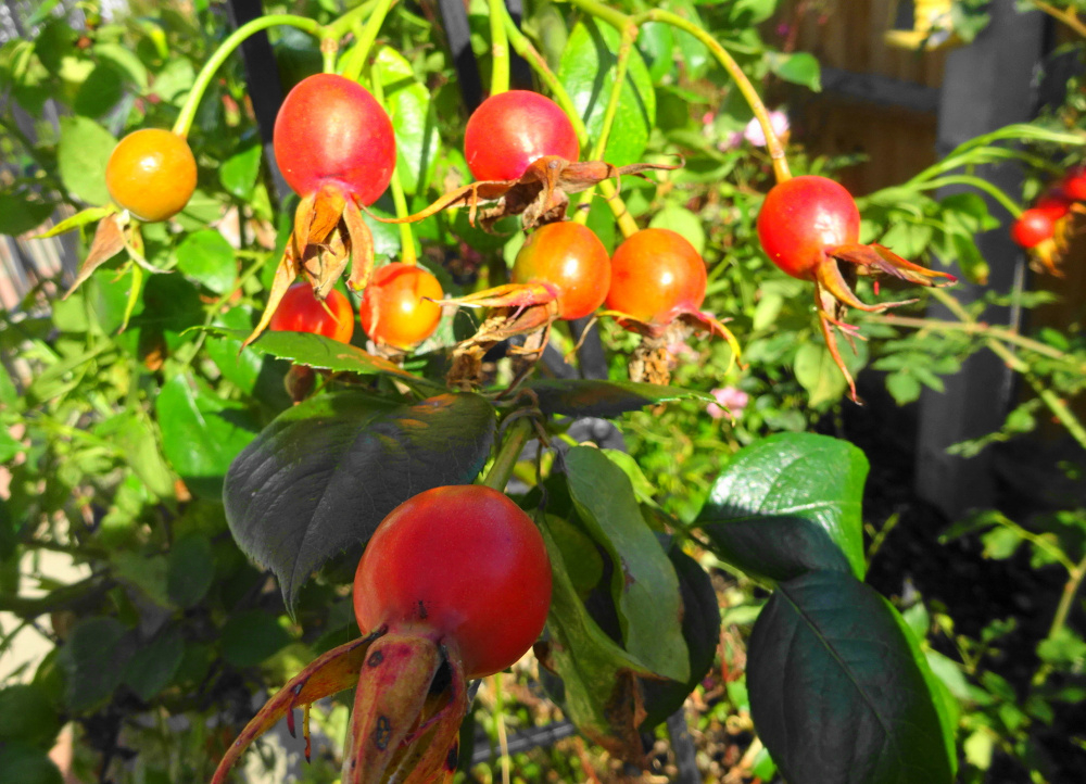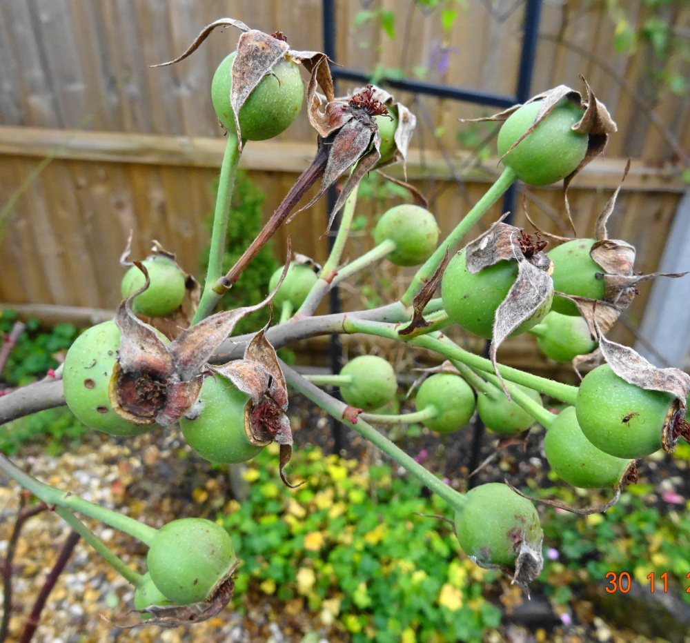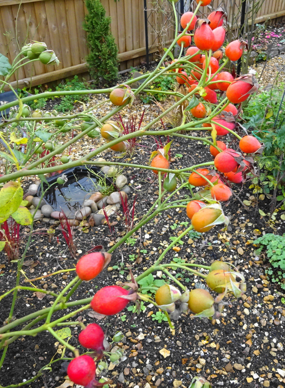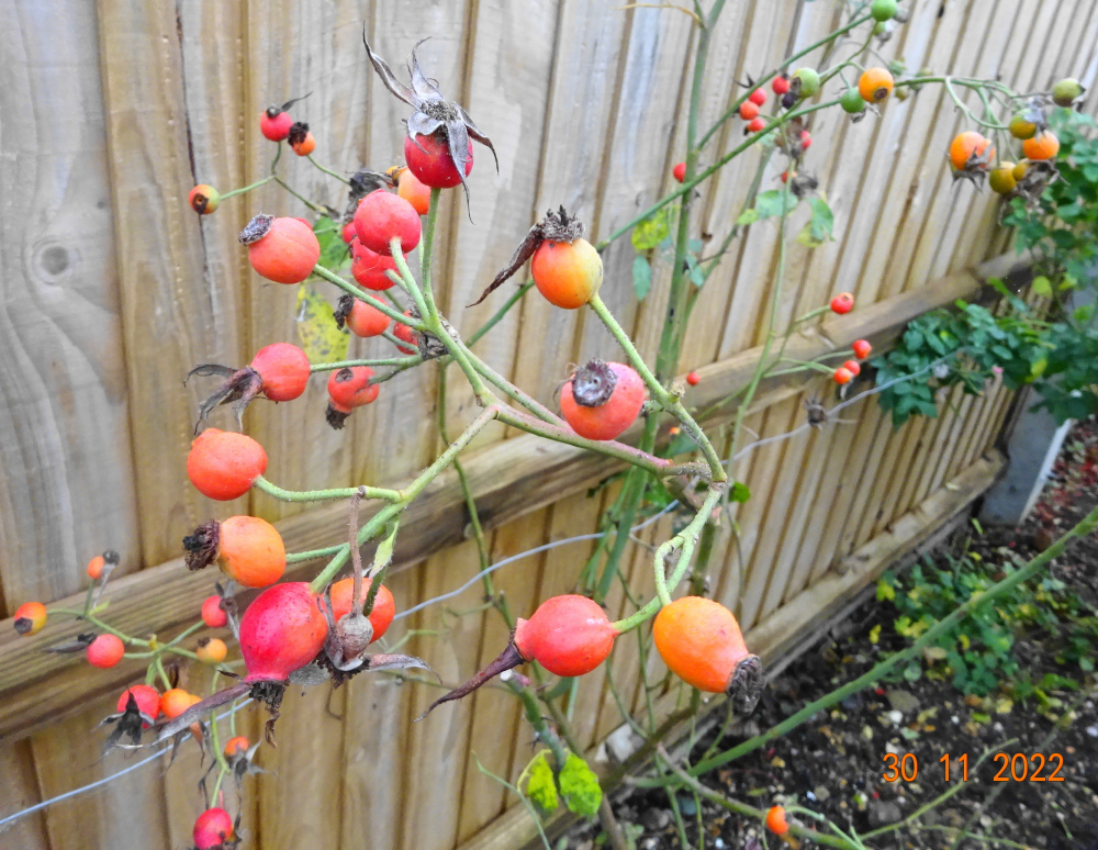 'Wilhelm'..a red Kordes shrub rose, that doesn't need deadheading to continue flowering, so hips can stay on.. that way they colour up earlier..
