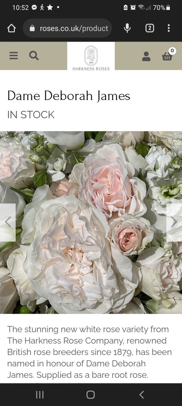 I keep wondering about ordering the new white/pink Harkness rose named in honour of the late Deborah James. The blooms look perfect. I wish they included shots of the whole bush on their site, though.