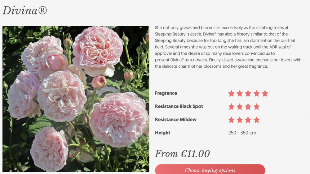 Divina, a new climber, looks good. Tantau mark fragrance out of 5 and disease resistance out of 4 so it gets a rare full marks. As a comparison, they give Soul 4/5 for fragrance and that is really strong and delicious to my nose. Vomit-inducing text though 😆