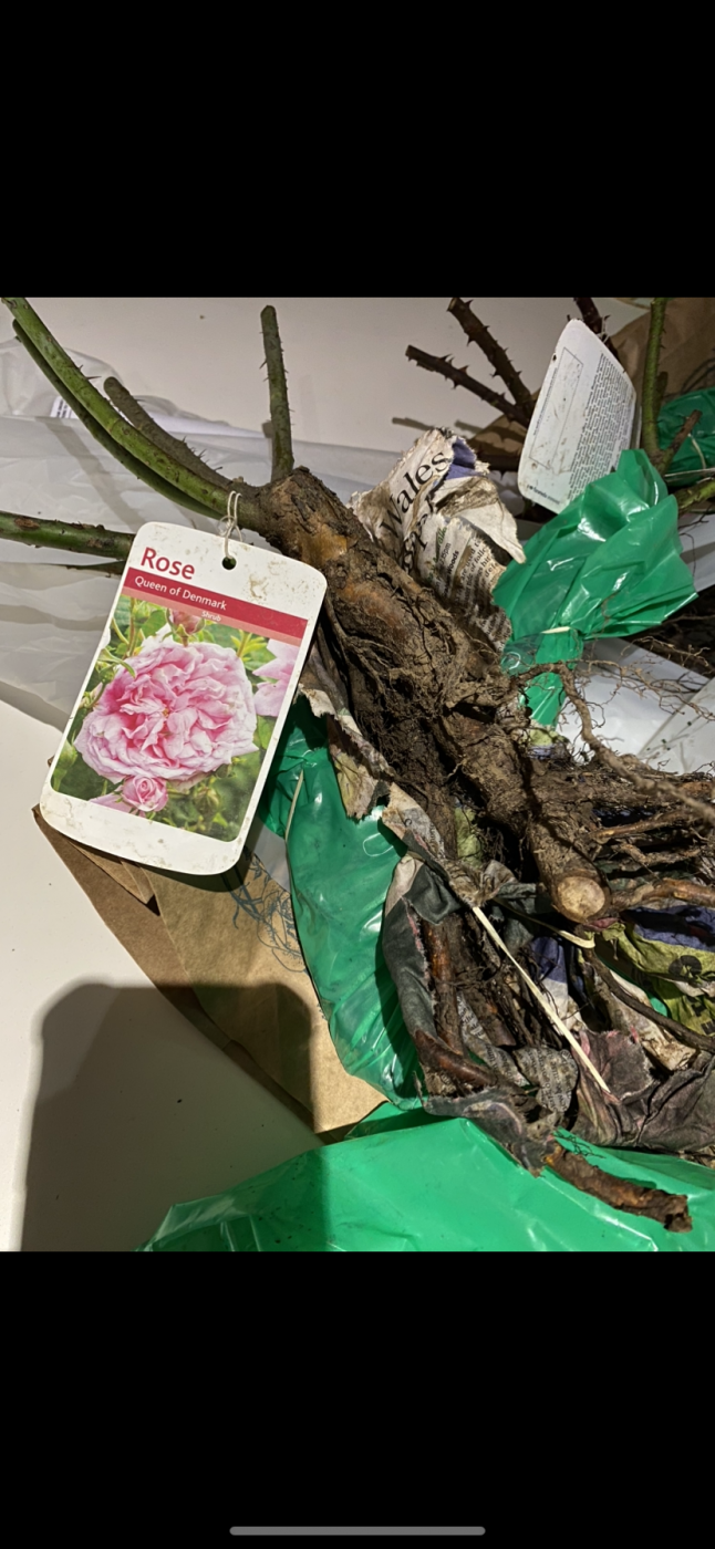 Your QoS should be fine, big chunky rootstock - that pruned root will have been very long and the rose won’t suffer for it. Your bare roots will be ok at the side of the house but plunged into a large bucket of water right up to cover the graft. Do that double pronto as the small feeder roots will dry out fast and it’s important to keep them hydrated until you are ready to plant. If you are due a heavy frost, maybe better to put the bucket in a garage or porch, but not a heated house.