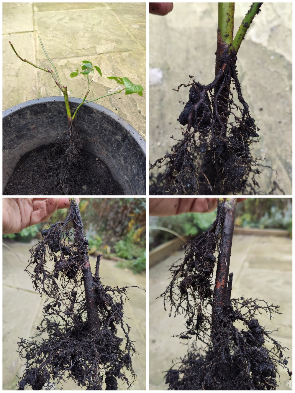 I decided to take it out and report it into a larger pot with fresh soil. The root growth is interesting. Must have been quite a long cutting with three nodes below the soil, you can see three distinct patches of root growth, one near the top, one in the middle and the largest at the bottom.