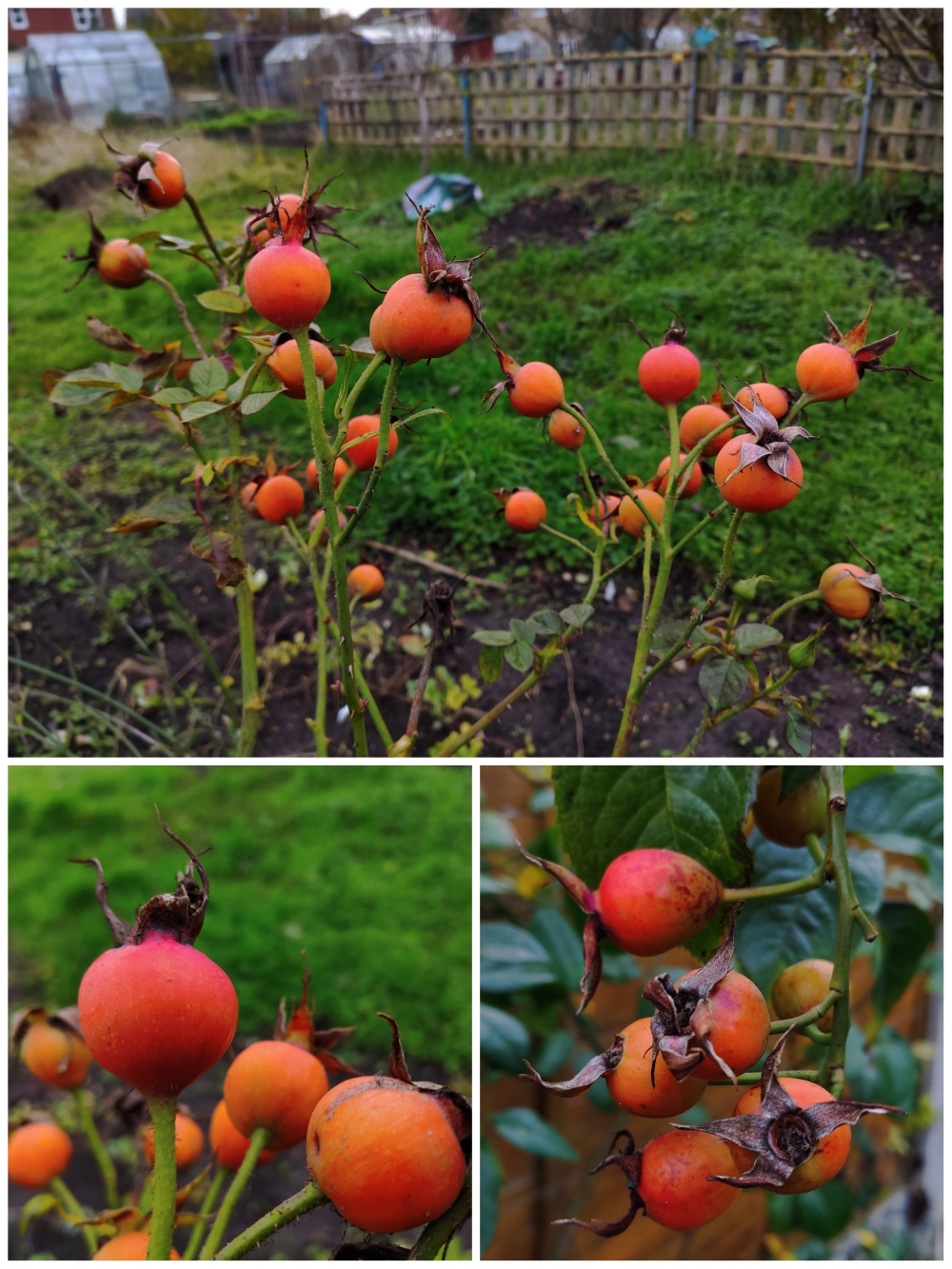 Some hip pics - Arthur Bell again top and left, The Generous Gardener right