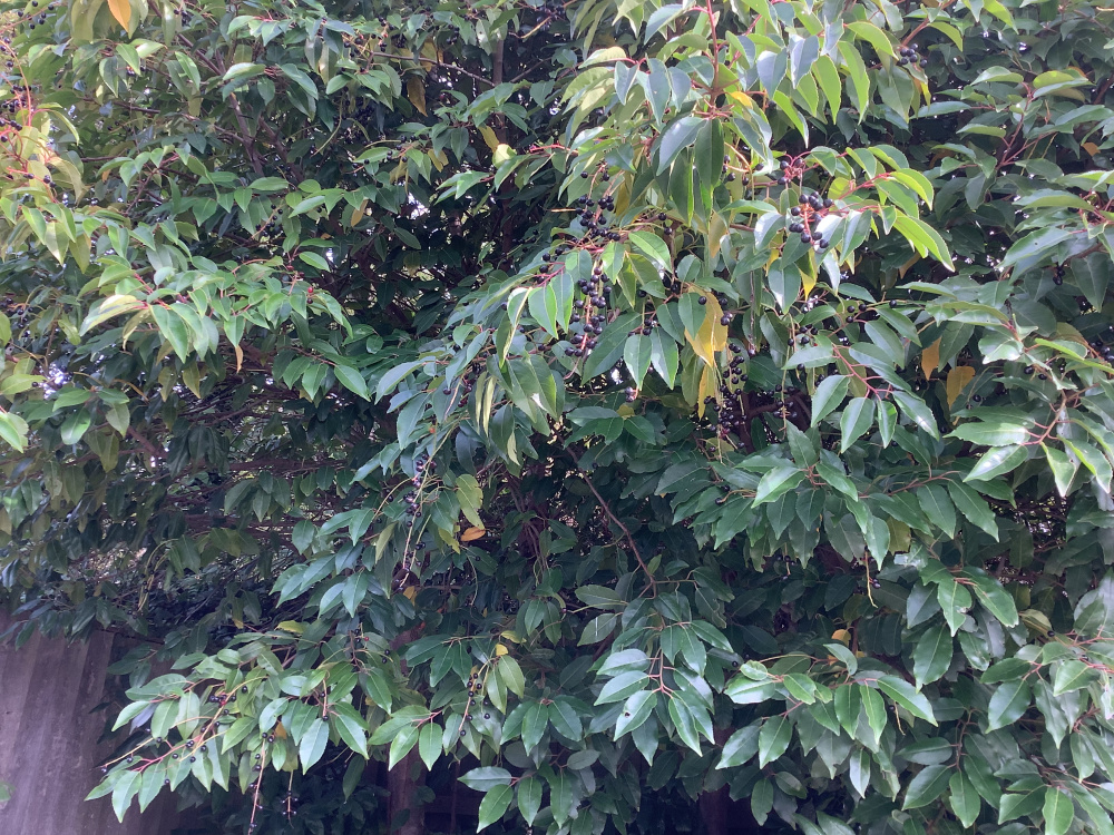 I am not sure what bush this is but I know it is quite common. I can’t ever remember it having berries on however it does sometimes flower with white trails. I did cut the bushes back earlier in Spring. Has this induced the berries? They make such a mess with the fruit and leaves but also provide a sound barrier and home for the wildlife.