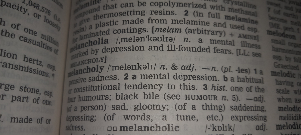 Nollie, you might not associate melancholy with depression, the Oxford English dictionary in English says different. Melancholy is sadness at best, depression at worst