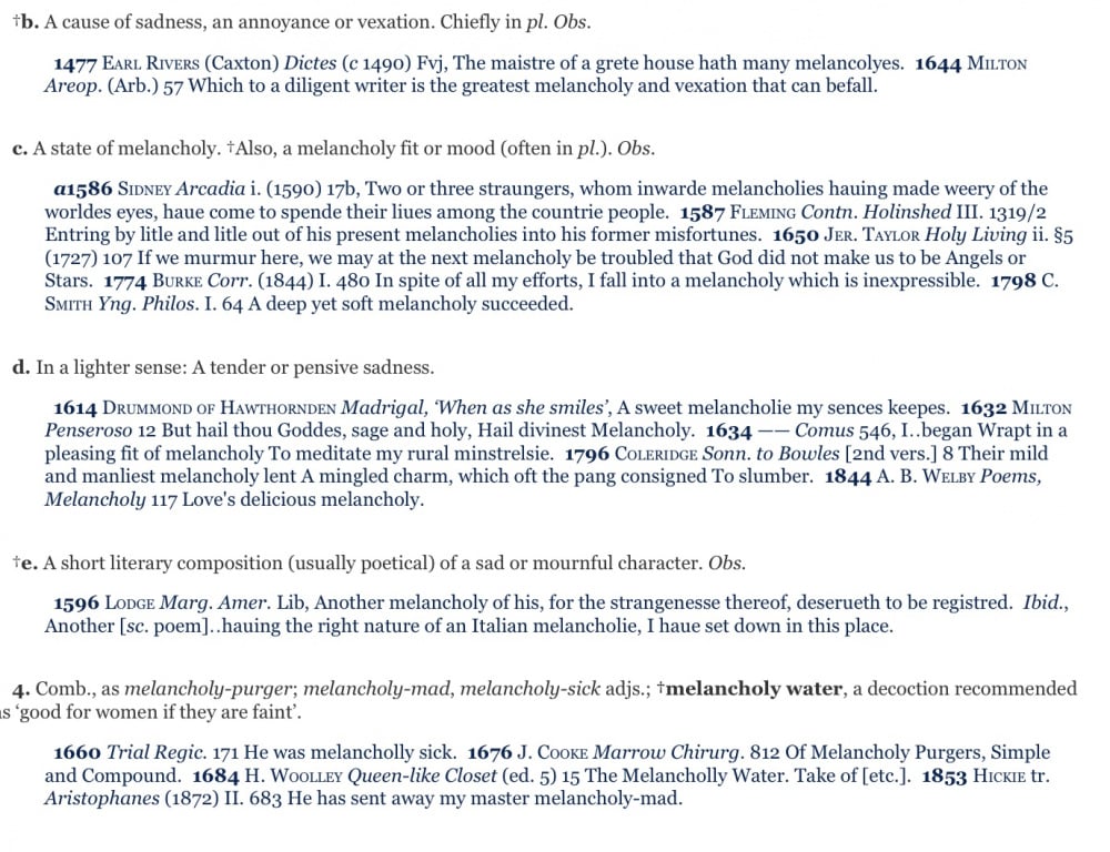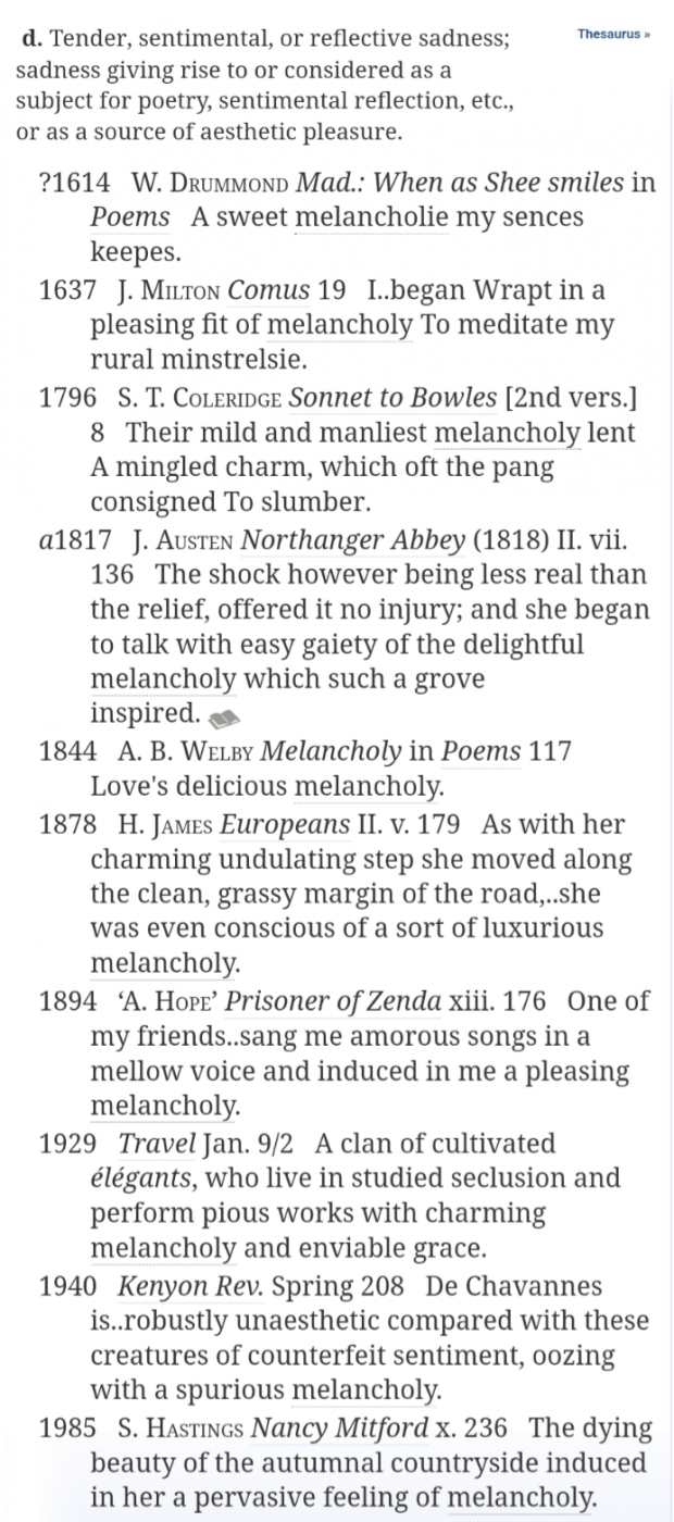 LG’s more recent definition speaks to me more, but it’s fascinating to read of its older, blacker meanings. My quotes were from the OED 1989 edition, here it is in full: