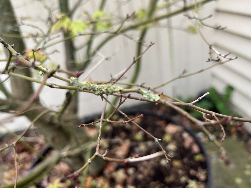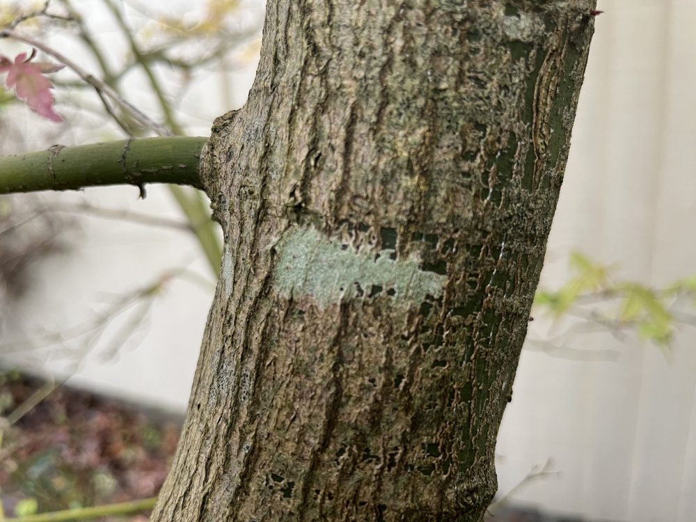 My acer has a green scale at the junctions of branches and strange green patches on the main trunk. Does anybody know what these are?