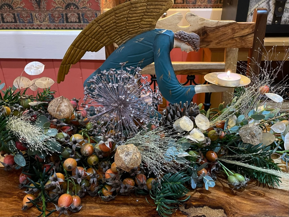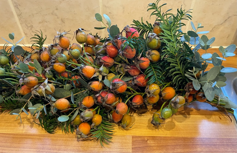 Here is my festive hanging basket, bit rough and ready but better than the remains of the dead plants! The trailing ivy had survived. I found some berried branches on one of our holly trees, and just stuck cuttings into the basket. .