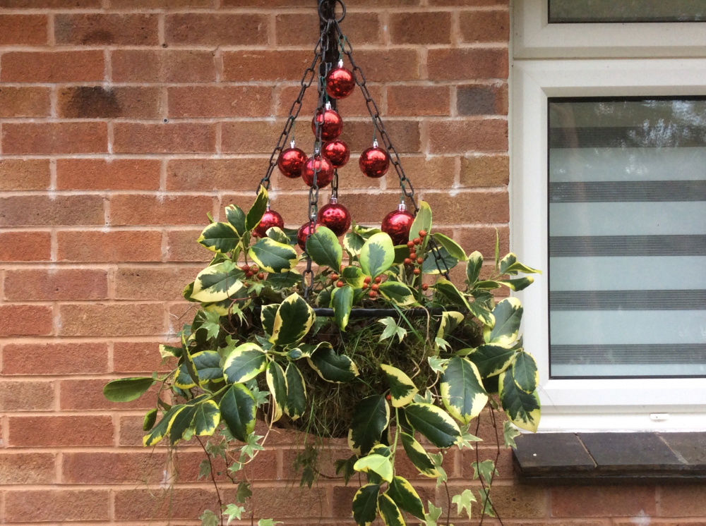 Lovely hanging basket @Ergates you were lucky to find Holly with berries... The birds have ransacked every piece I could find! Those lovely red baubles give it a cheery festive feel too.