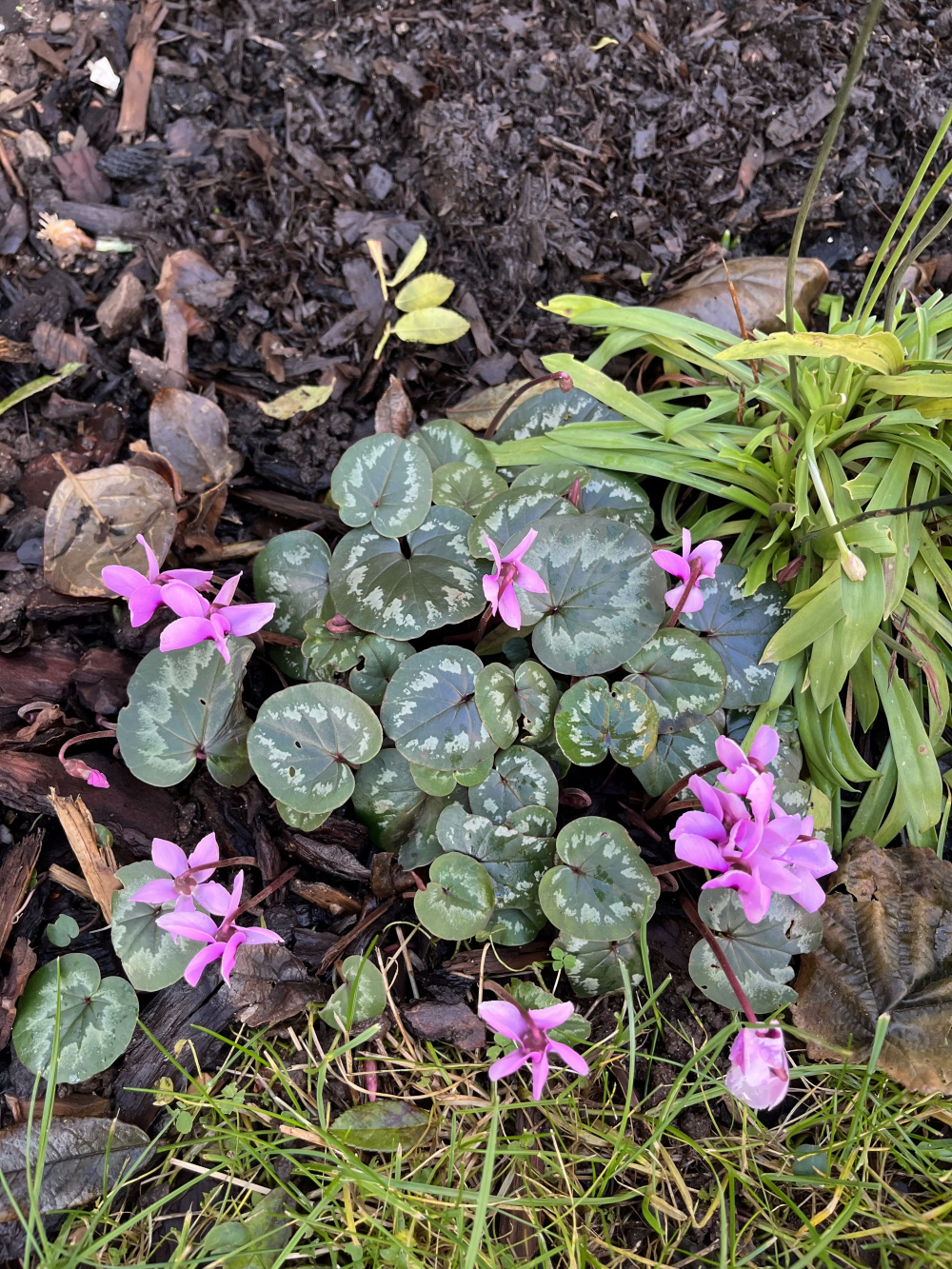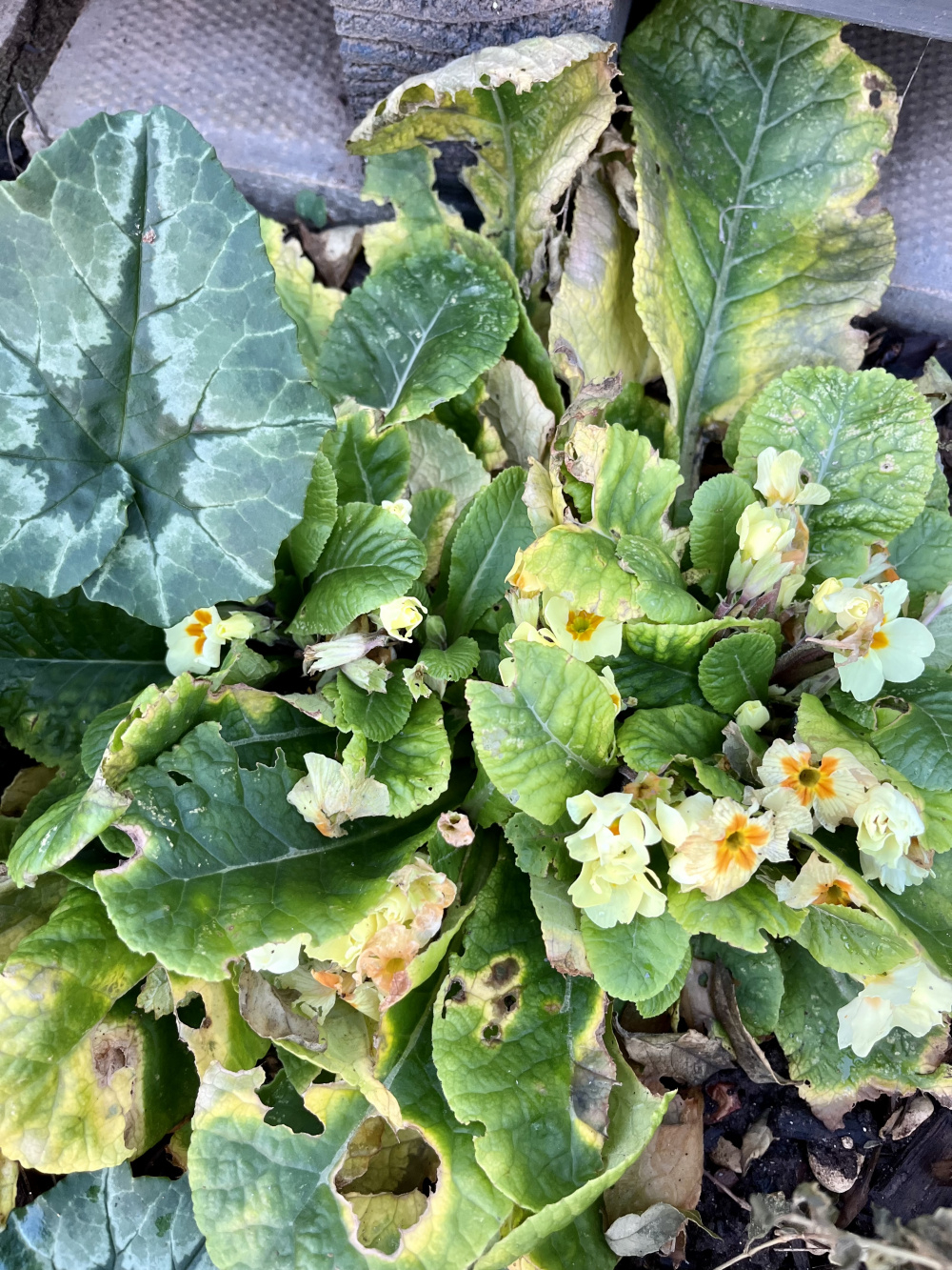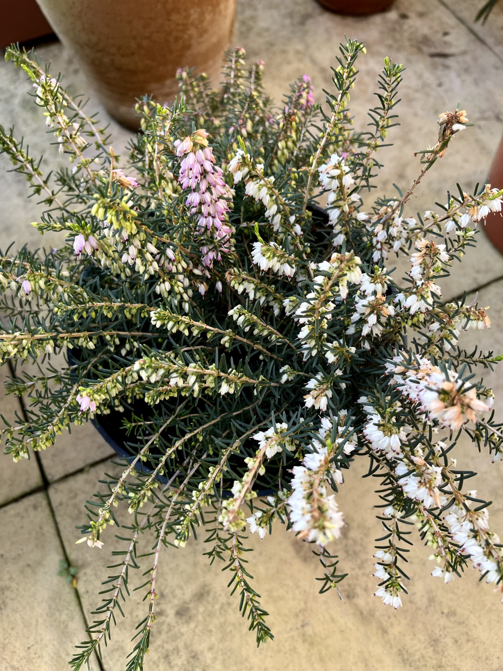 One cyclamen coum, some mouldy looking primroses, hellebore Merlin with two flowers on Viburnum behind, first flower on variegated Coronilla and small pot of Erica carnea.
