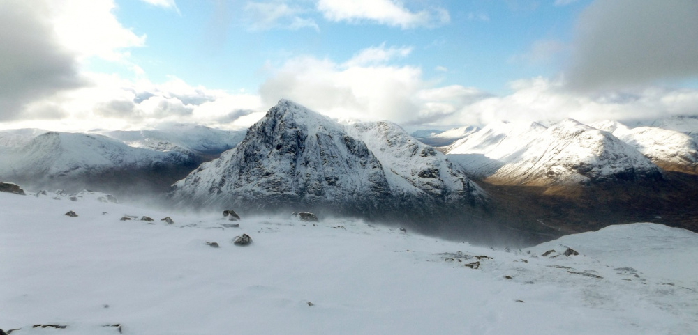 There's a longish run between Bridge of Orchy, up and past the Black Mount hills and Rannoch Moor, and Meall a Bhuiridh [ the Glencoe ski centre] and then you see the bulk of SD appearing on the left. It's hard to miss, even in cloud and fog.
