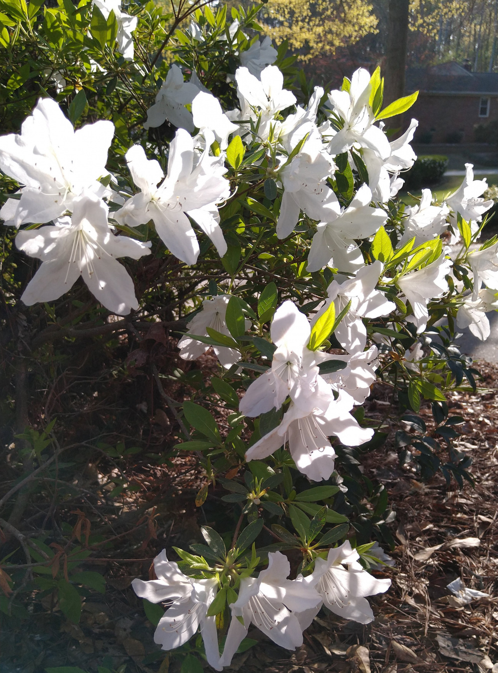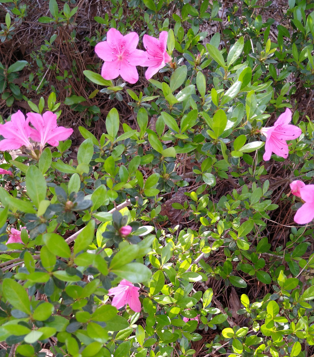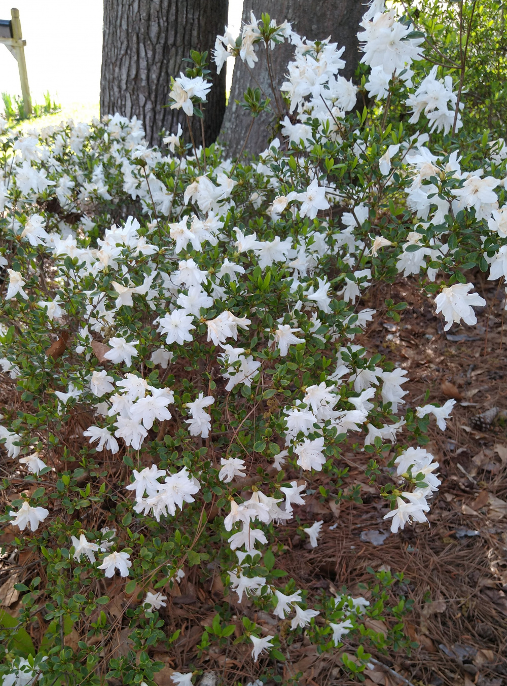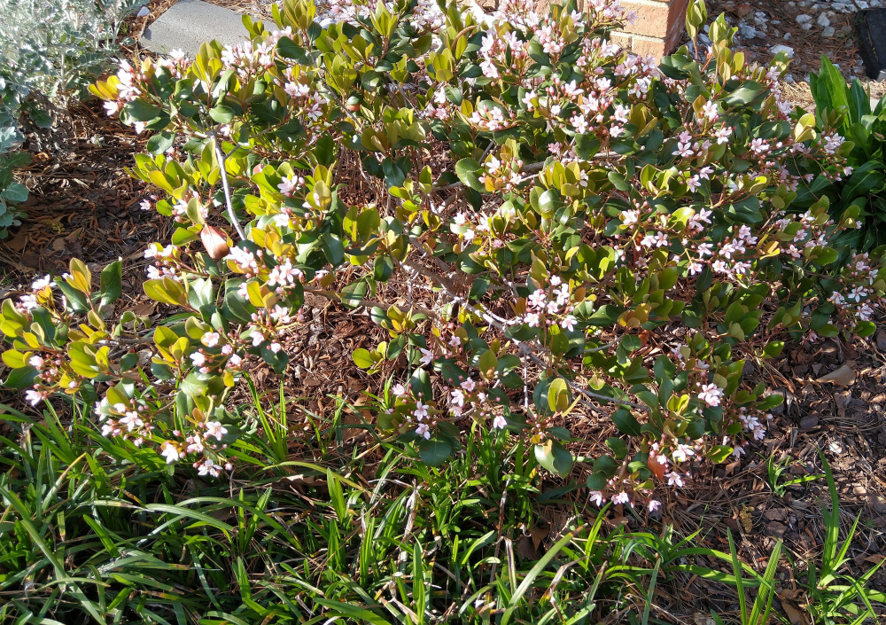 Indian hawthorn (rhaphiolepsis indica 'Eleanor Taber') is evergreen with a sweet pink flush of flowers in early spring. This photo has washed out the color unfortunately.