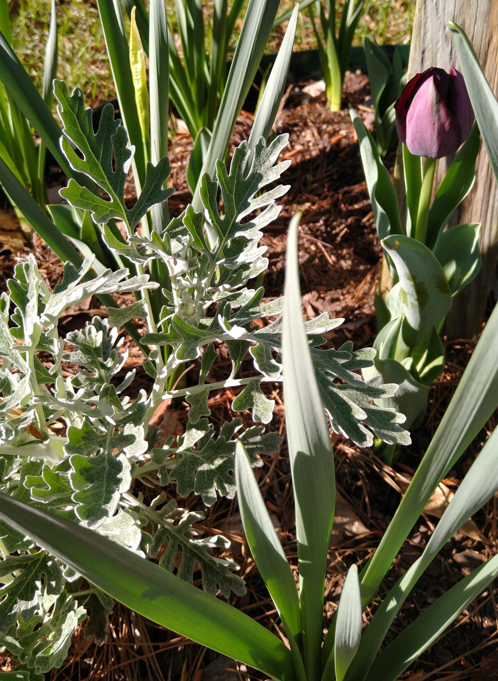 One lone tulip waiting for its daffodil friends and tulip brethren. Dusty miller is evergreen here so I have pops of silver all over the place.