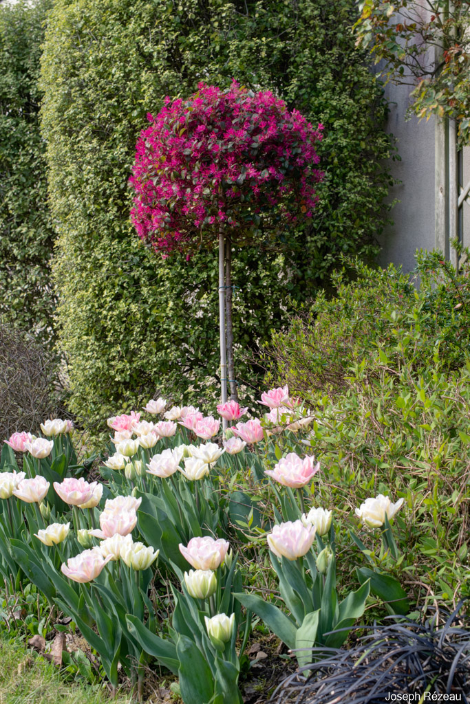 2 shades of pink: Tulipa 'Angélique' at the front, not bad for the 5th year in place! Loropetalum chinense ‘Fede’ standard and at the back Pittosporum tenuifolium.