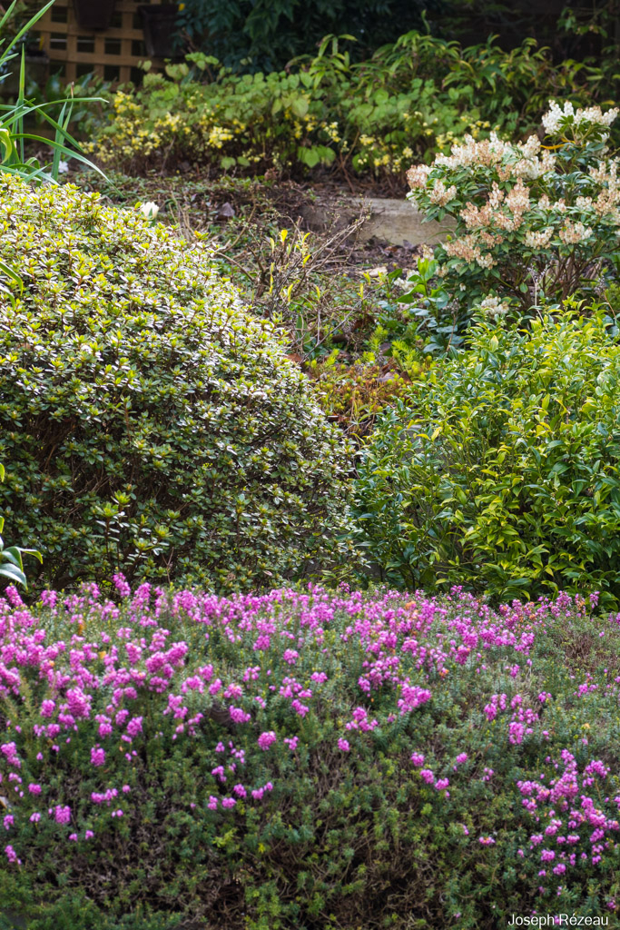 From front to back: Erica carnea, Rhododendron japonica 'Amoena Coccinea', Sarcococca confusa, Pieris japonica 'Cupido' and Epimedium x versicolor 'Sulphureum'.