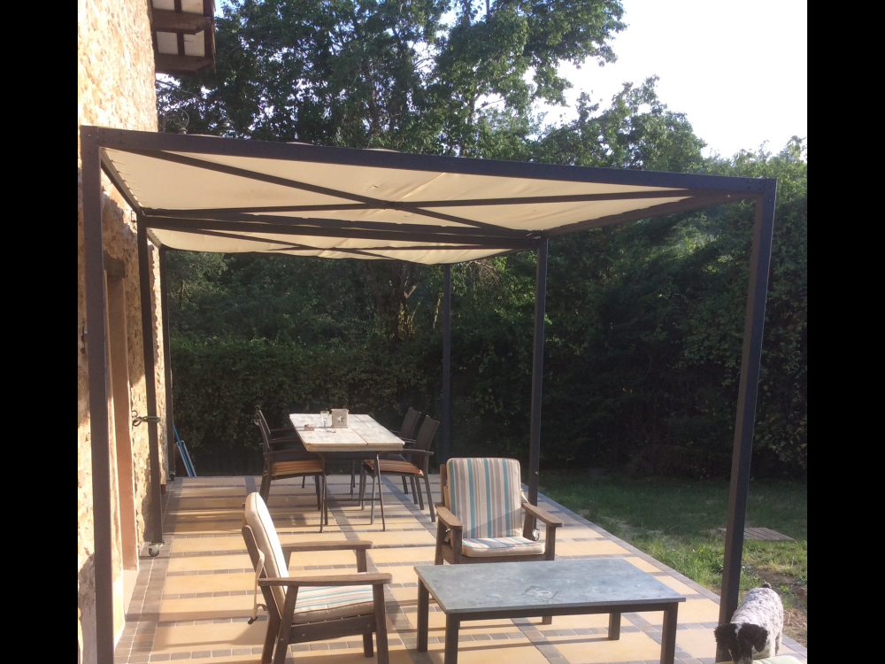 We bought this four years ago as a temporary solution for the west-facing terrace but it’s so useful and flexible it’s still there. One section wheels over the other to half the amount of shade and the fabric covers are easily removed, washed and stored over winter. The whole structure easily wheels out for wall maintenance but the 8 lockable castors mean it’s very stable when static. We fixed outdoor venetian blinds around the table section for further shade control.