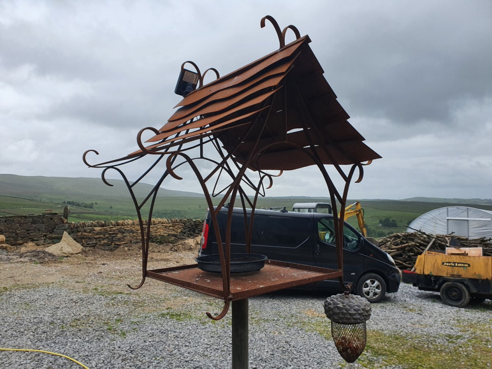 Yes of course, here you go. The first two are as they are when made, They're purposely left bare so they mellow with age, get some patina (rust!) and blend in. They're hand made and I make sure there are no pieces touching which harbour water, if they can drain and dry they last a lot longer. If water is trapped (on wood or metal) it causes it to decay. I've worked with metal and wood all of my working life so know it quite well. The few birds we have here are liking feeding from it at the moment.