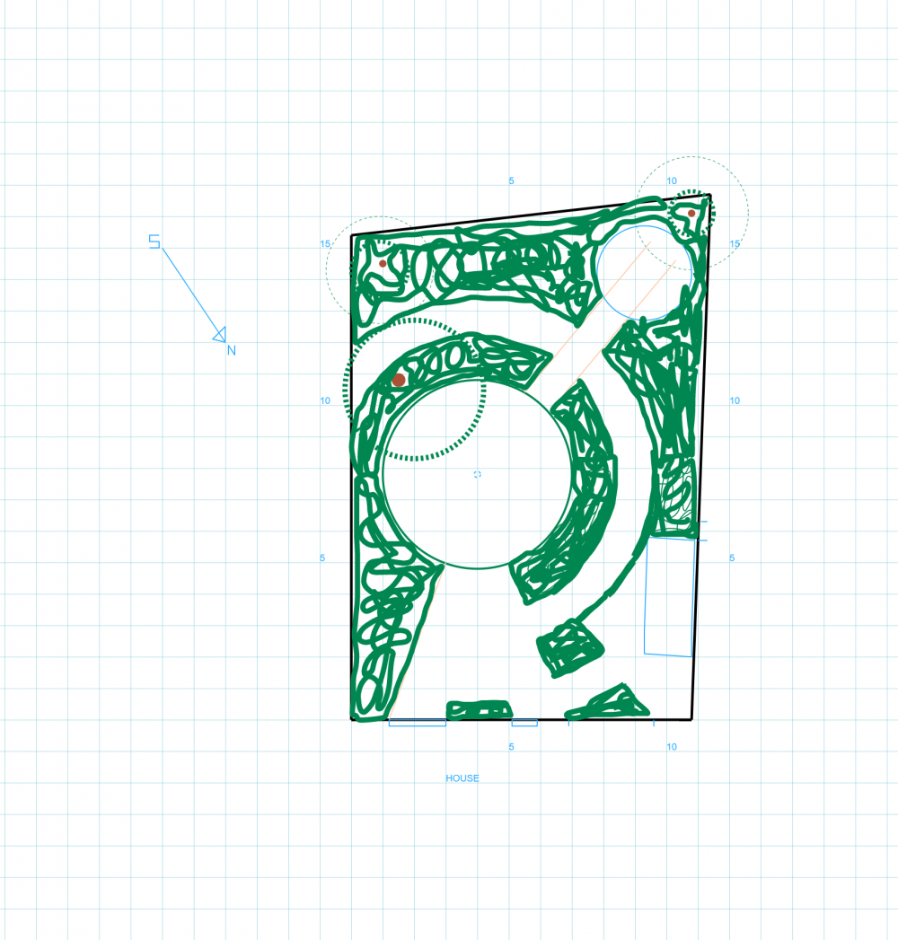 I measured up the size and shape of the garden so I could draw a scale plan today. The tree trunks and canopies are =/- about 25cm as I didn't measure those today but a mix of previous measurements, google maps and memory I've put the 2 biggest trees in with heavy dashing for their current canopy and light dashing for their 20 year spread (the biggest one is mature and not getting wider so not that one).