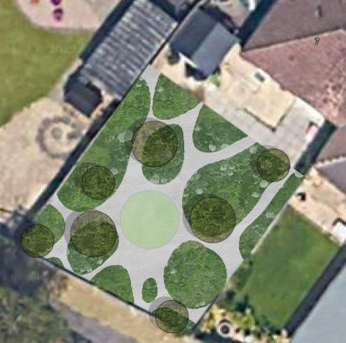 I can't draw organic shapes so I tend to just copy shapes from nature e.g. giraffe patterns. In this case I've added a circular lawn, admittedly a lawn that size isn't really practical and you could just omit or use paving.