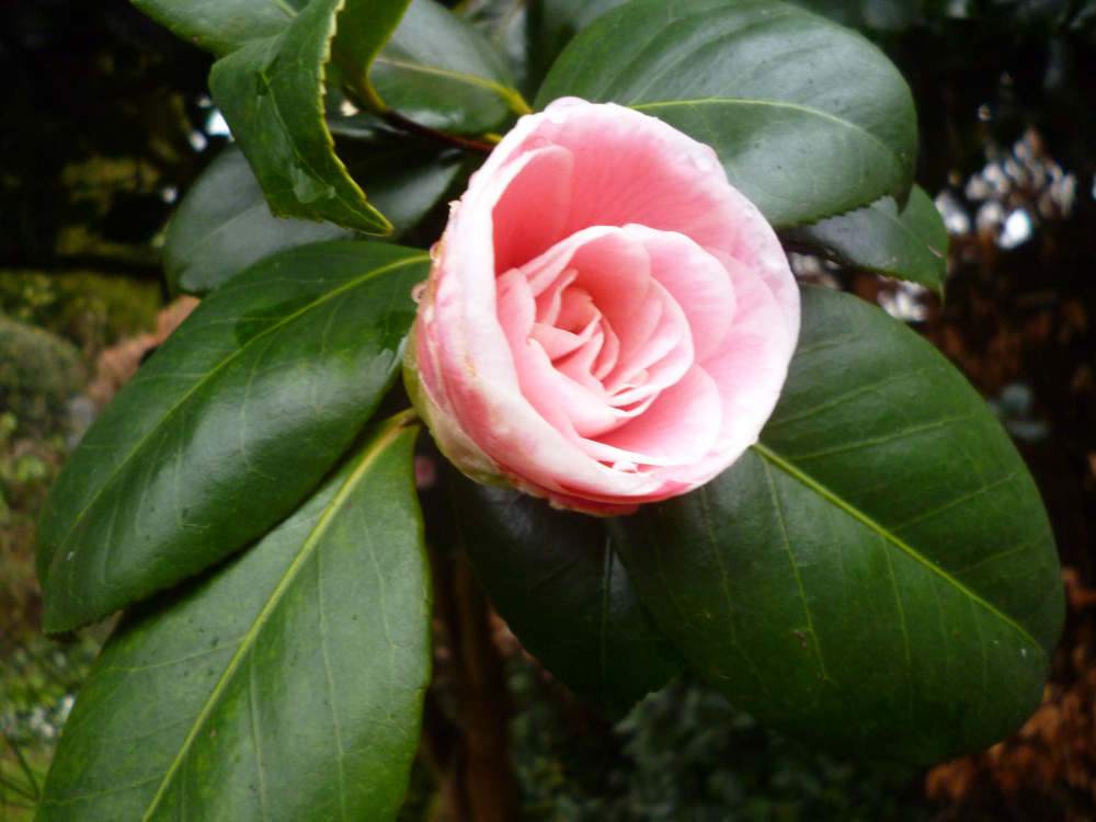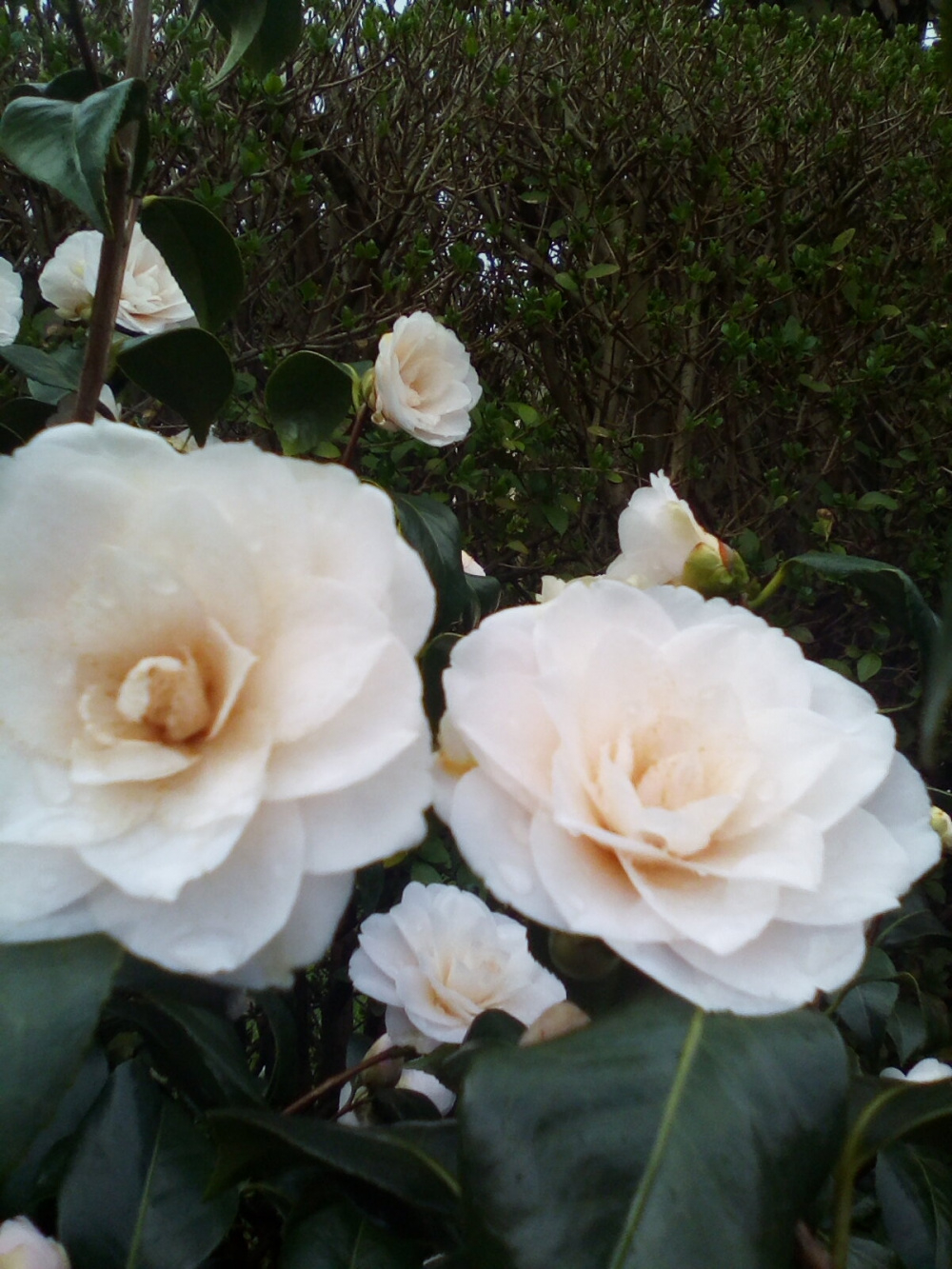 Gloire de Nantes. japonica My first one out. On a house wall; never gets any sun; builders' mess for soil; now up to first floor and as wide; trained flat. Starts with just a few flowers in December. The best for leaf.