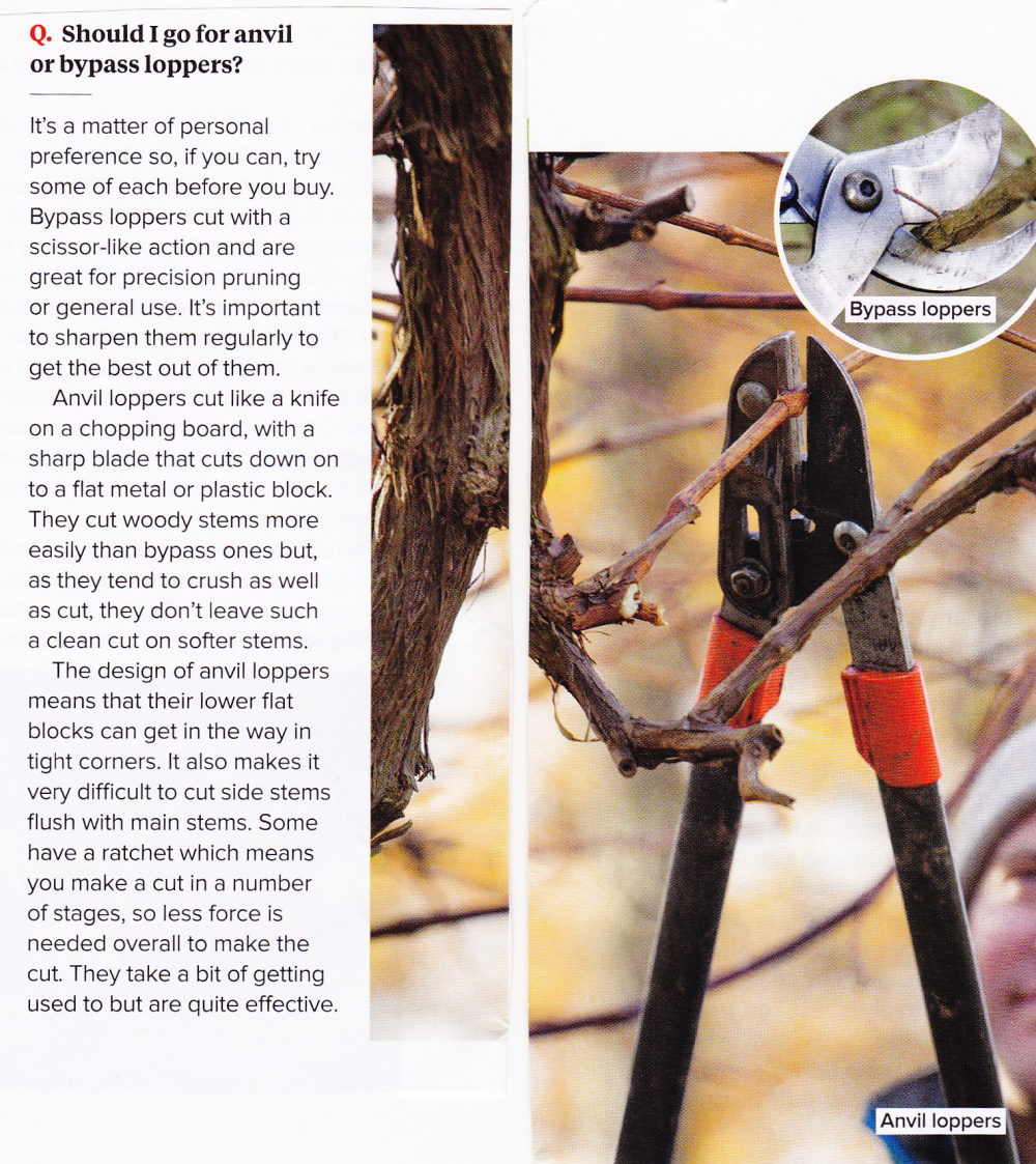 Go for bypass loppers and only go for Felco loppers. I have been using the same Felco model No. 7 secateurs for nearly four decades with a blade, spring and shock absorbers every few years.