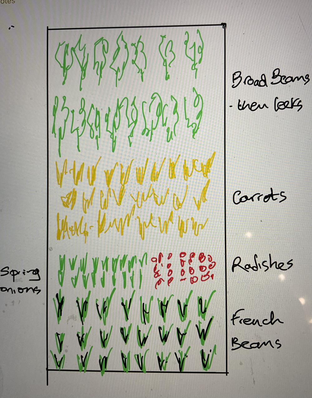 The bed is 8’ x 4’. I grow strawberries, tomatoes, peppers and runner beans elsewhere. On an earlier post I think I said I spend about 10 minutes a year planning my vegetable growing. Well, you’ve now had 7 minutes’ worth. I will spend the remains three minutes deciding the exact boundaries between the various crops.