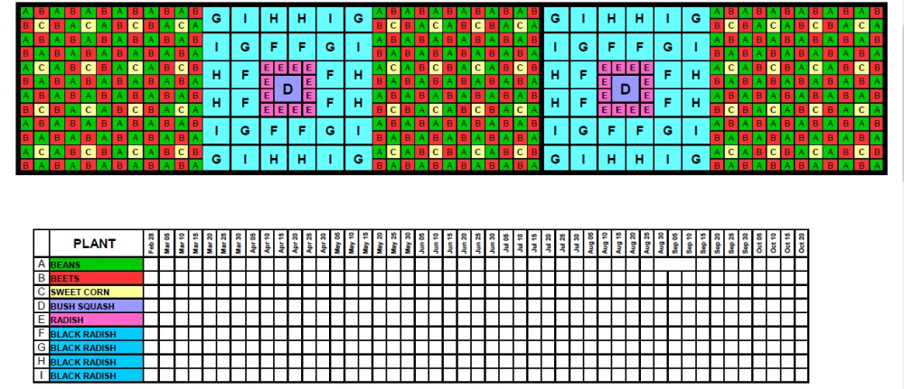 my feedback is… your plan shows 180 beets, 180 beans, 48 sweetcorn, 64 black radish and 2 squash! you say your bed is 4ft wide and your plan shows 12 segments so this equates to a 4inch square per plant yet you are giving the black radish 8 inch spacing, and corn only 8 inches apart? Are you sowing these all at once or successionally? You say this is just one of your beds? I hope you have plenty of space to store your harvest as I feel trying to consume 180 beets will be tedious.