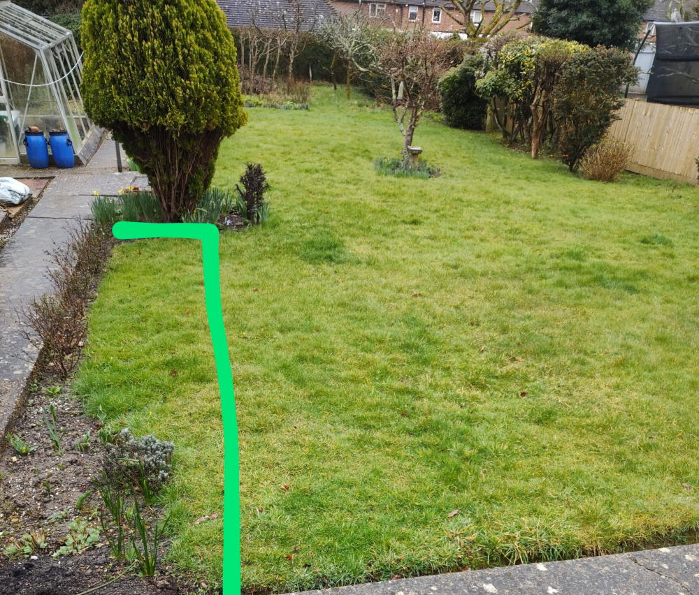 Maybe, but what is that little plant next to the conifer? Could you position the length just outside that little plant, so that everything is within the new border? That would make the new border parallel to the stepping stones that lead to the greenhouse. I think a solid rectangular shape could also complement what looks like other straight lines in the garden, re the other shrubs and trees in the distance.