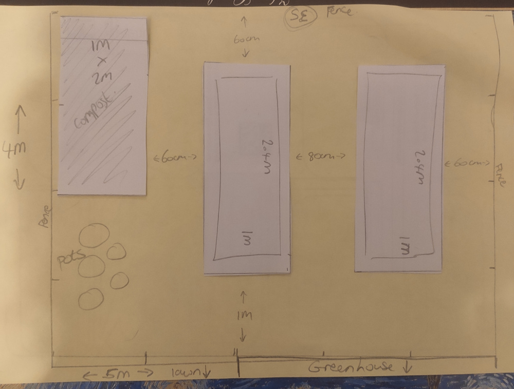 I have a plot 4x5m behind my greenhouse. It's currently empty and I want to put in some compost bins and raised beds. Is this the best layout? The garden faces south east and has fences around three sides and the greenhouse and lawn behind it. I want to grow dahlias in one bed and gooseberry, rhubarb, strawberry, raspberry and maybe a few salads leaves in the other bed. Any suggestions welcome! Thank you
