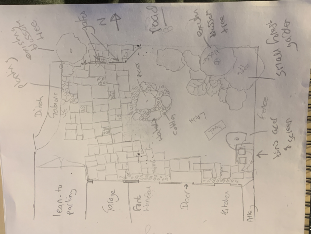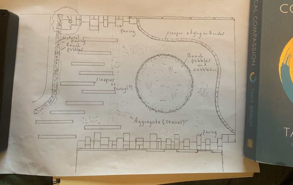 To give more of an idea of plot, the contractor did this sketch, his adaption of the designers thoughts. He is probably more skilled in groundwork than plants but he has done some nice landscaping ground work in the area, The whole space is roughly 11m square. Existing blossom tree top left with drive entrance beside it, theres another to the right side not on drawing. Existing gabion cages to left (straight n curved) Bungalow at the bottom with from left, garage, living room window, front door and kitchen window. We will probably put wheelie bins behind hurdle screen bottom right We are considering a small forest garden top right, designer has also suggested a small acer near bins bottom right and another on island.