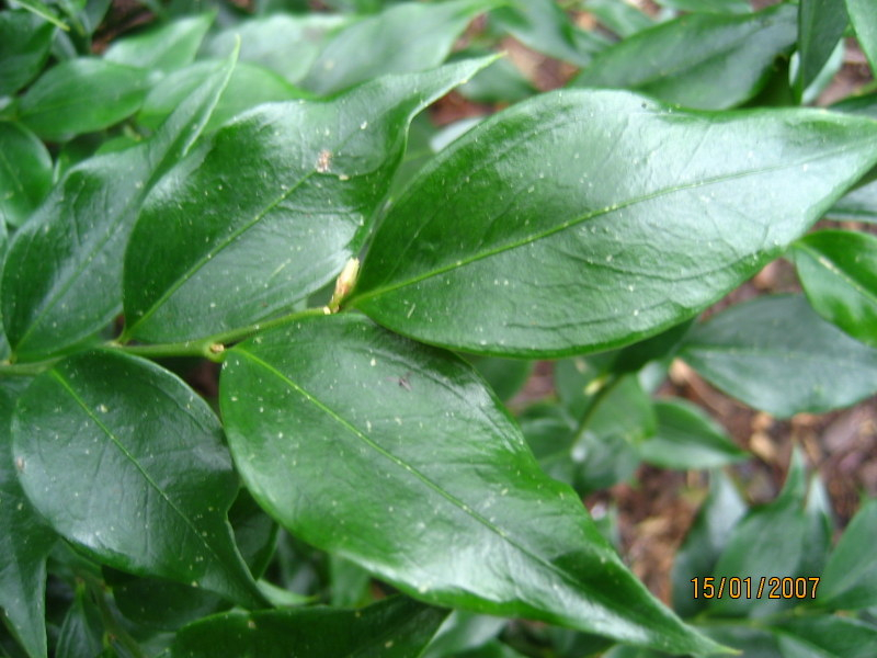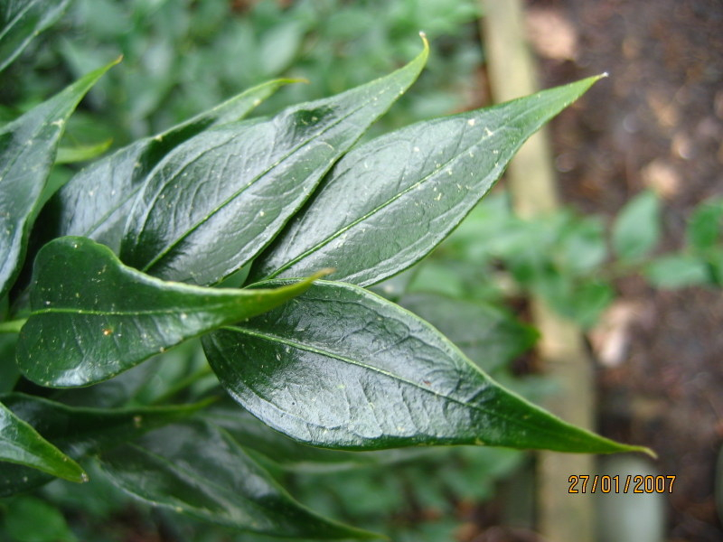 "Prunus lusitanica.... Leaves ovate or oval, 21⁄2 to 5 in. long, 11⁄4 to 2 in. wide, quite glabrous on both surfaces, very dark, glossy green above, paler below, shallowly roundish toothed. "