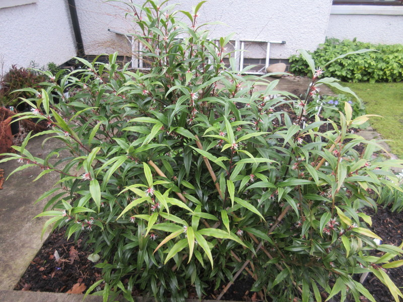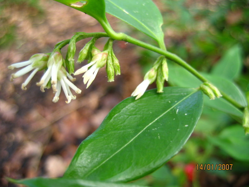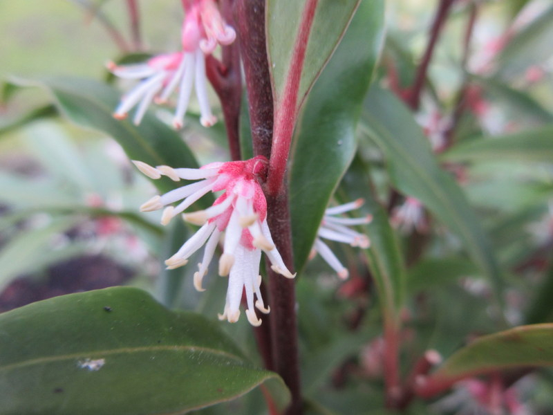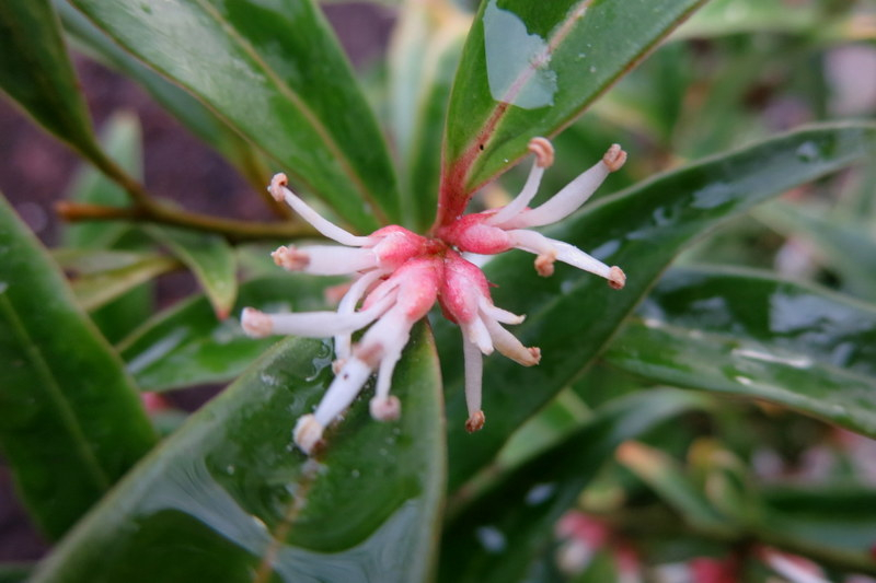 There are a few species of Sarcococca. All have glossy evergreen leaves...and miniscule flowers I find it hard to id one from another. I grow several different ones.