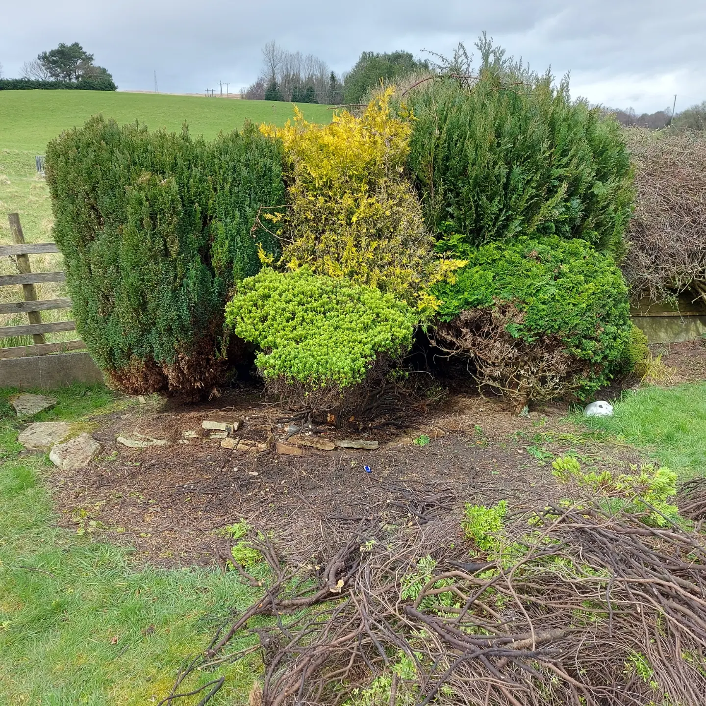So I have recently started to clear a border at the back of the garden - I have so far taken out a very very large hebe (you can see where it had grown out over lawn), found a whole lot of stone under there and plan to take out the conifers too. So I'll be left with a blank canvas.