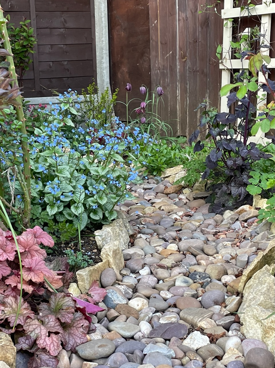 I’ve made this path in order to have better access to the plants growing in the border. On the left there’s a sitting area with a clematis growing on the side of it and a large yew tree. The path ends with the yew tree which is a focal point in itself. However. I find my eye being drawn to this empty corner between the shed and the fence. There’s a small columnar berberis growing there, but it’s very slow to develop (no wonder, it’s a very dry patch). Any ideas about how I could improve this?