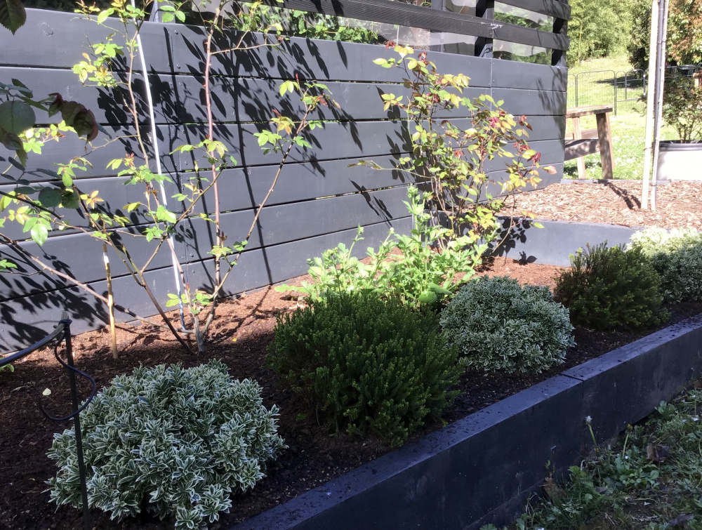 The Hebe Green Globes in between are proving a bit too tender so will probably go eventually. I have some nepeta growing on to fill the gaps: