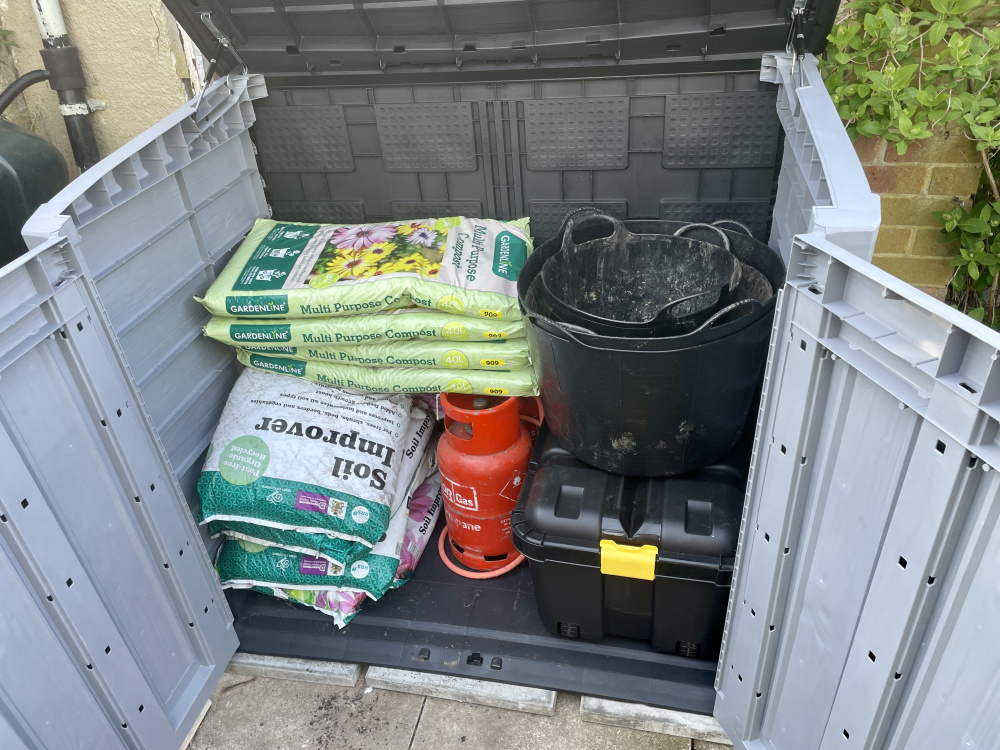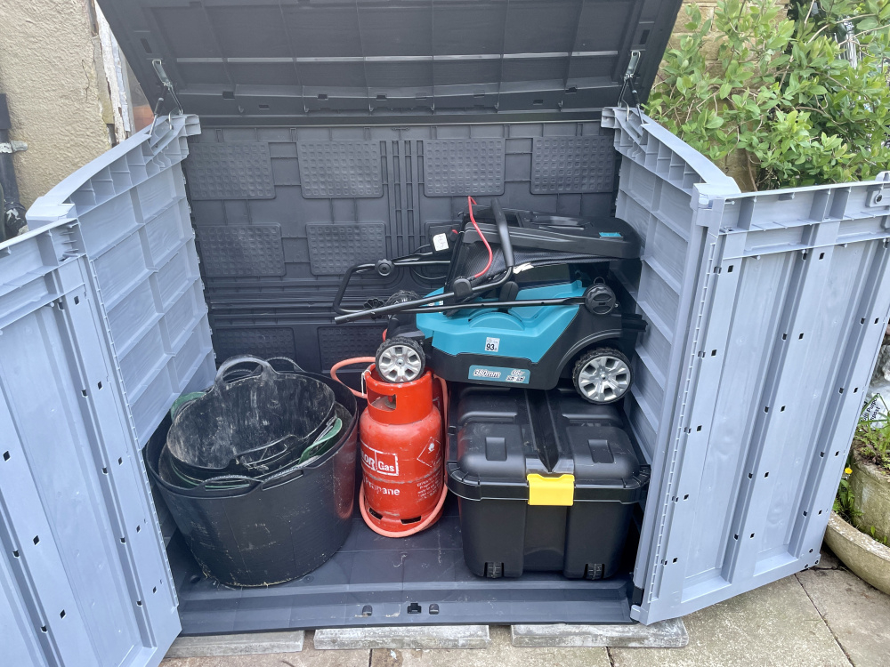 The Keter box up is starting to fill up with gear, I really ought to fit a shelf inside..