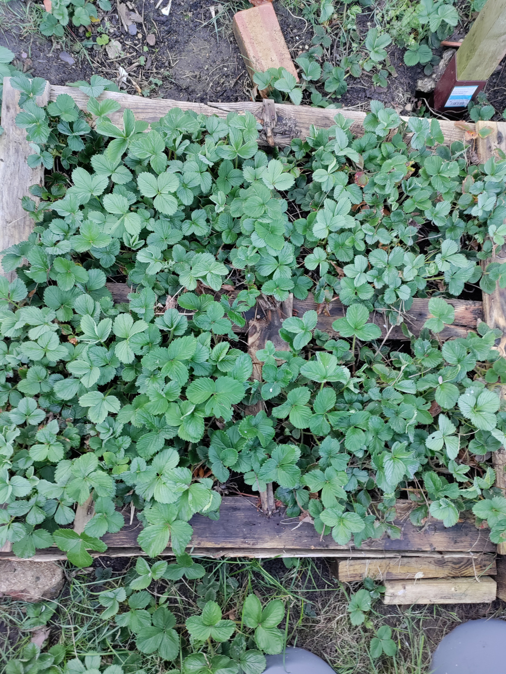 I have laid flat a pallet base with a few slats removed on the ground and made a strawberry bed. It is now in it's third year. HTH.