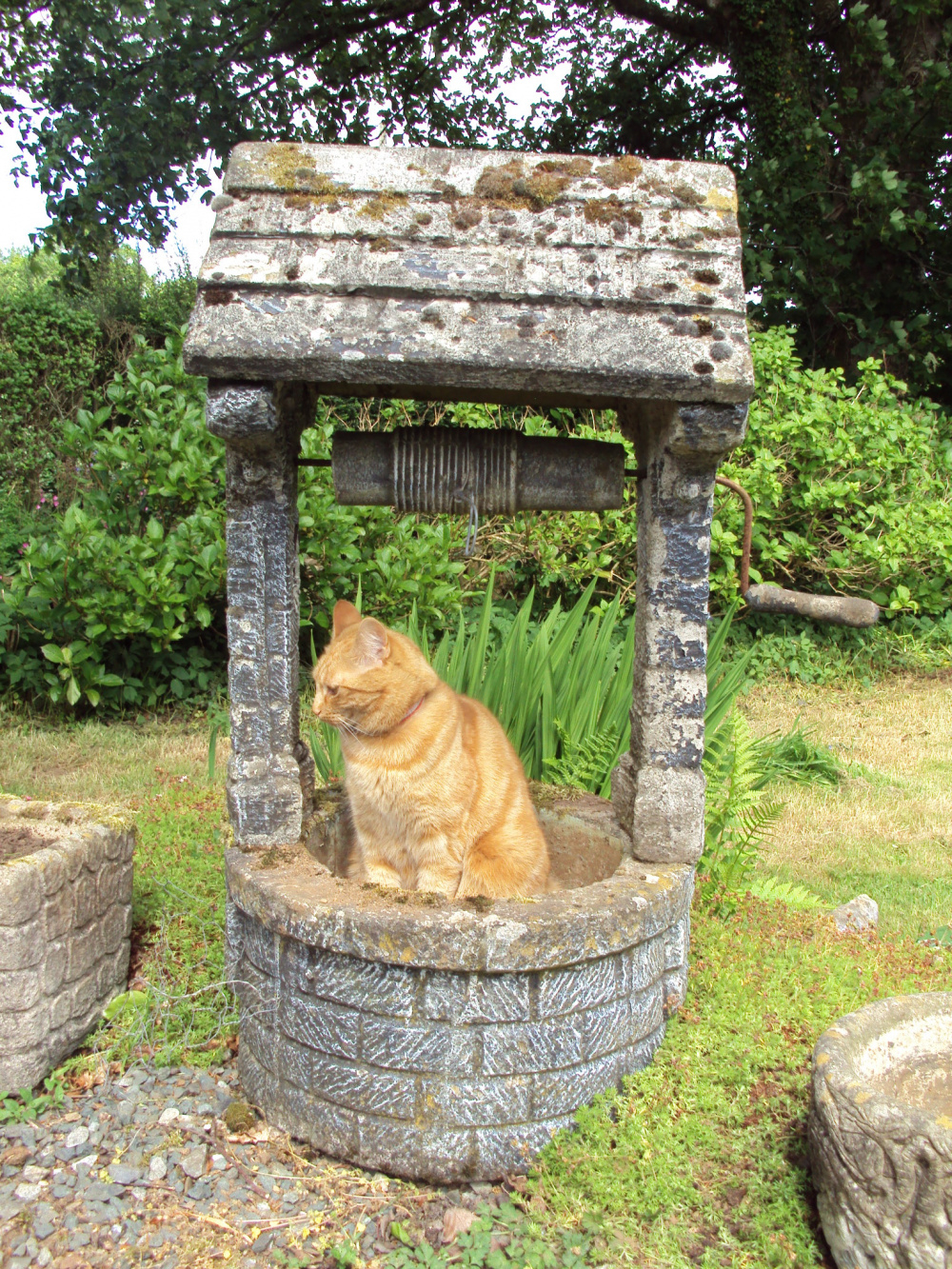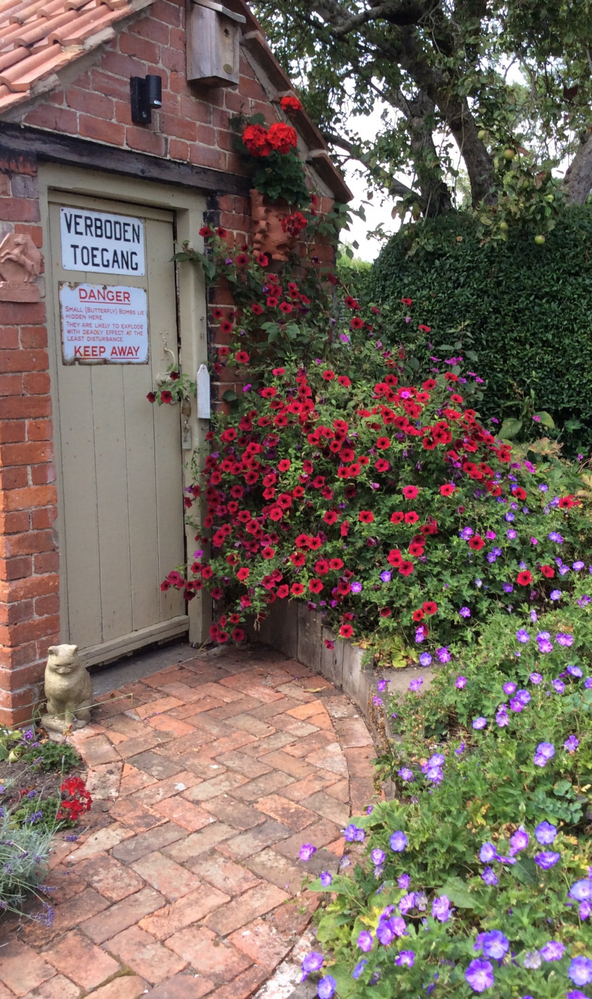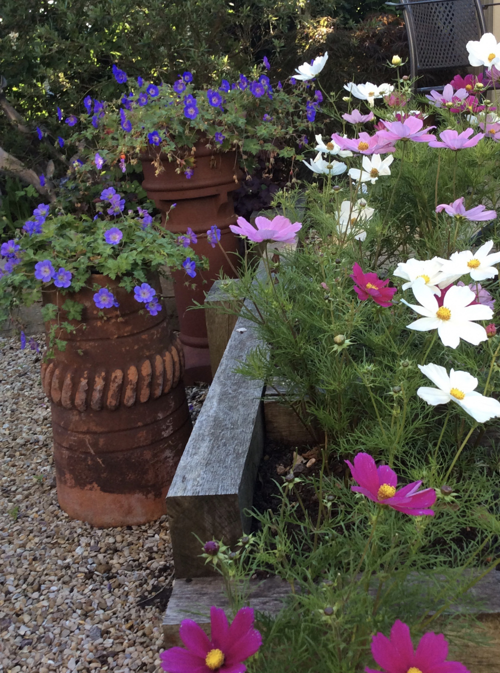 The red petunias are in a copper washing pot with holes drilled in the bottom