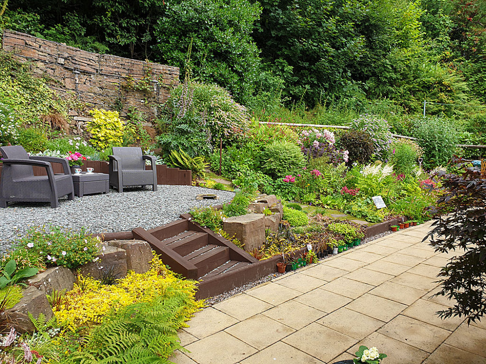 The weather today was mixed and brollies were often required but what a really enjoyable, if tiring, day. Buxton is a hilly place but the panoramic views from some of the gardens offered plenty of reward for our efforts. One very unassuming (from the front) terraced cottage owned by an artist had been totally remodelled at the back and offered absolutely stunning views across the lovely sloping garden, across the town and to the hills miles beyond. This park home on the site of an old quarry is an absolute delight. They have created a secluded little enclave at the rear of the house set into the steep quarry face, guarded with rock-filled steel gabions. Walking around the side of the chalet-type structure you have no idea such a gorgeous garden could be behind it.