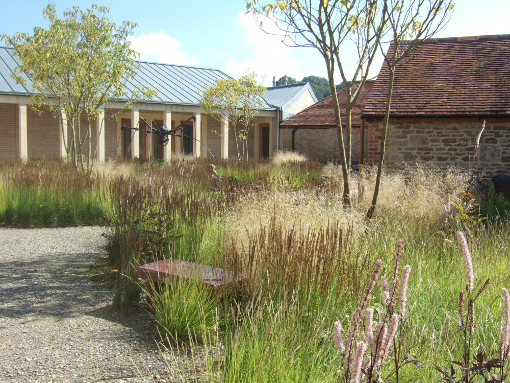 I always go back to Oudolf's courtyard at Hauser and Wirth. It's mixed with Sesleria and Deschampsia which are faster to get going in spring (Sesleria is semi-evergreen). Sesleria is excellent for hiding bare soil! There are perennials in there but spaced very widely, like sculptures almost.
