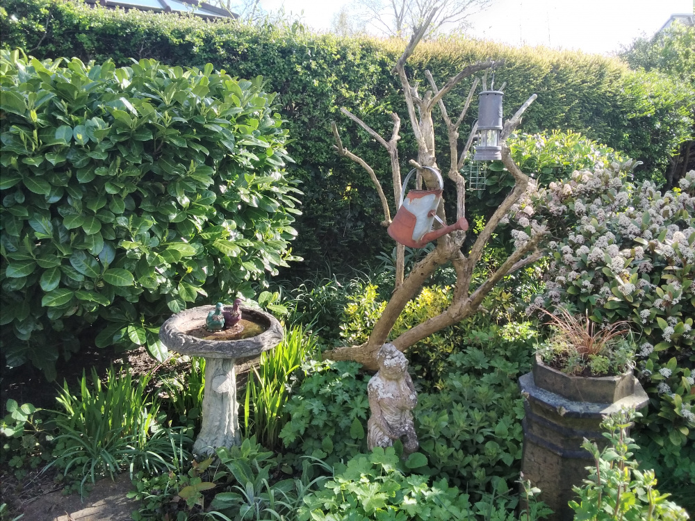 Like quite a lot of sun but with the best will in the world, I suspect it may struggle considering the amount of ground cover you have there. Perhaps you could fix a hanging pot on one of the branches with a trailing plant to give you a splash of colour for the summer? Nice looking garden BTW