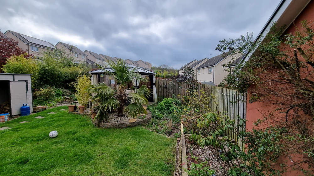 I extend the raised wooden bed round the outside of the garden, meeting at the back of the patio/Gazebo. In front of this, I turf the area