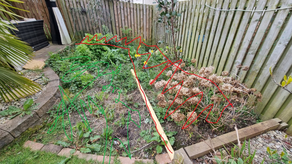 Not the best pictures, but hopefully these show the area and the idea, red colour will be raised bed, green will be grass.