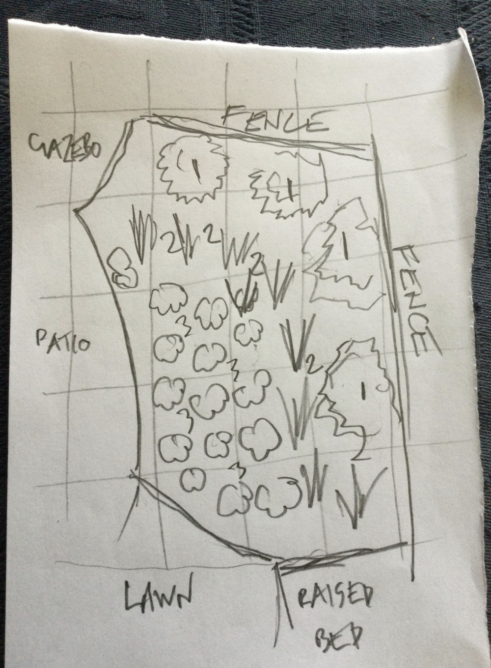 I extend the raised border at the right hand side to the end of the back patio where the gazebo is (so not the curved stone bed, but behind that where the gazebo is. One thing, that patio is higher than the raised bed, would this look odd? What would I plant here? Just more large and small shrubs and a lot of the perennials, I would then turf the area in front so extending the lawn a little
