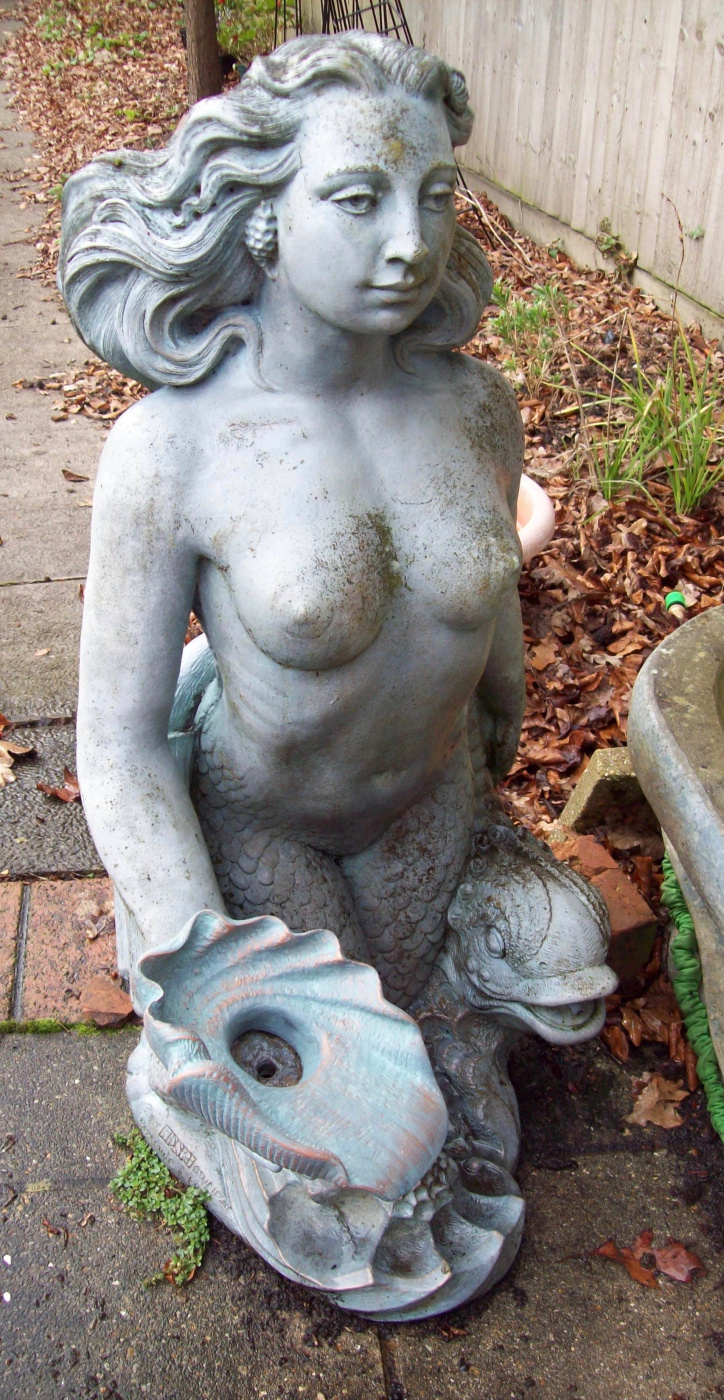 She is a beautifully detailed top of a Henrii fountain and at the moment sitting in my lawn waiting for me to dig a pond for her to overlook. When I moved I sold the base and shell that she sat on but kept her.