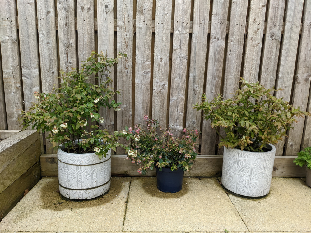 I already have two blueberry bushes (in the white pots), and bought another yesterday (in the navy blue pot). Can I put it in the larger white pot in the corner? I don't have any in the same size as the others. Will it be ok in this larger one despite being younger or will it dry out/get root rot?