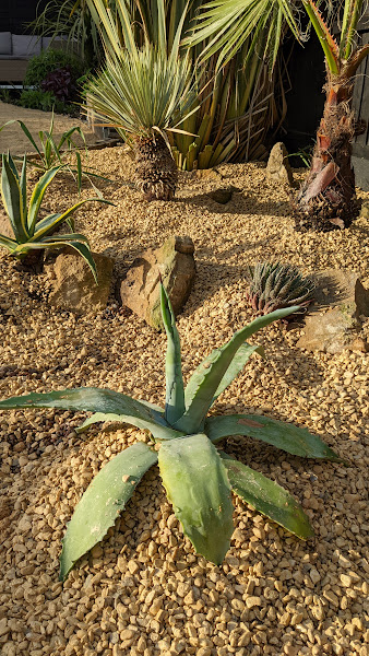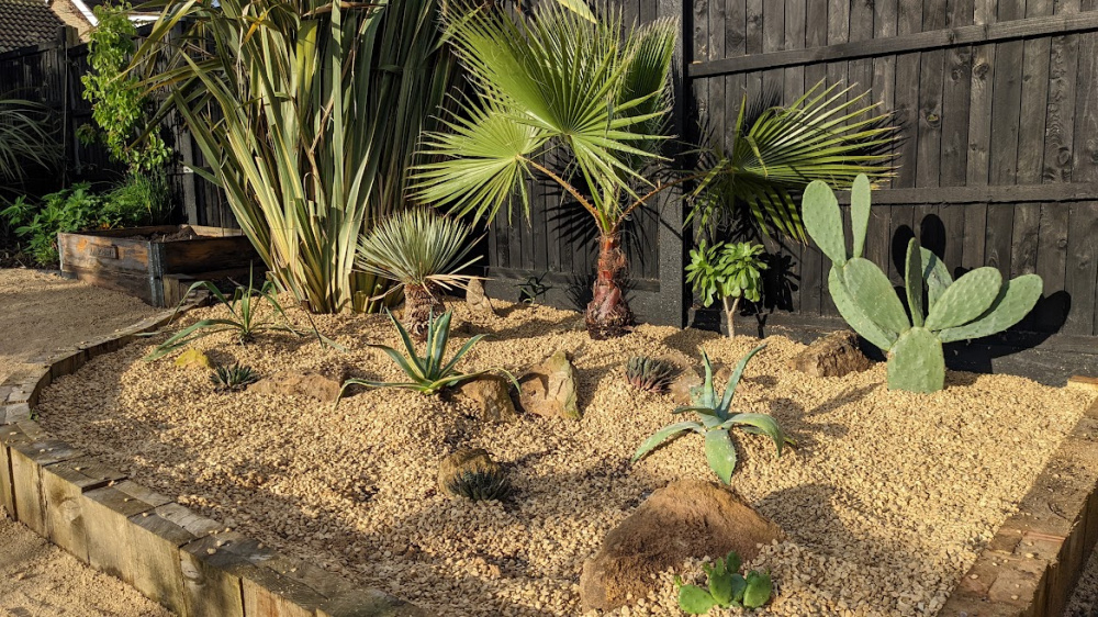 I created a raised bed with railway sleepers, and filled it with gravel. I've planted hardy or semi hardy arid plants that will enjoy the sunny position and ample drainage. In winter, I'll build a shelter to keep out the winter rain. I'll be tinkering with the planting when I can source specific wishlist plants that I know will do well here.