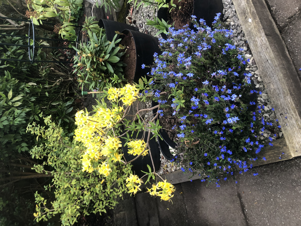 The rhododendron is scented which is unusual I know. It does look pretty now but to be honest it won’t look too good in a few weeks when the yellow flowers have gone. Have you considered a rose? Mine do well in large pots and have a longer flowering period than rhododendrons.