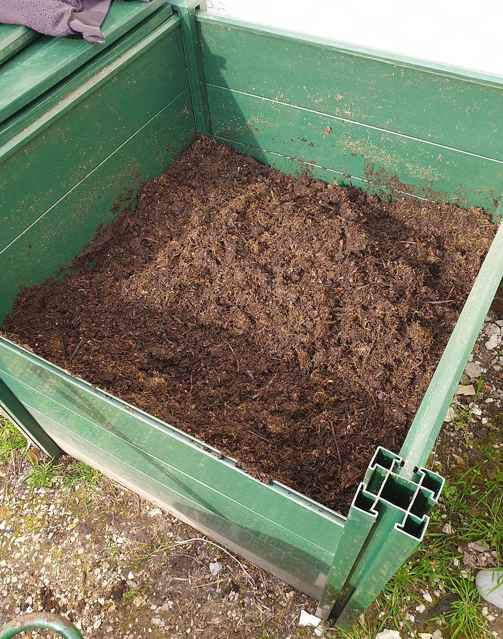 Amazing how one thing can lead to another. For me last year started with the purchase of a tripod ladder to finally get on top of the overgrown shrub/trees (Laurel & a very invasive Berberis julianae that had reached a height of 15' through a Hawthorn tree). The combined amount of spoil was massive but I managed to shred down all but the biggest stems. Having filled my existing (and now well rotten) compost bays I then decided that a new system might be in order, so I invested in a new large plastic tongue & groove system. The first batch of compost (started in October), having spent some time at 60°C (and supplemented with horse muck) is now ready for use. It's looking like really good stuff. I've started an experiment with my tomato plants - some planted in bought compost, some in mine supplemented with slow-release fertiliser.