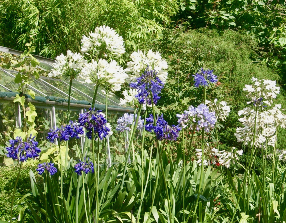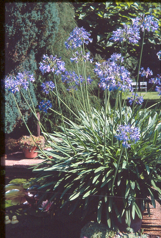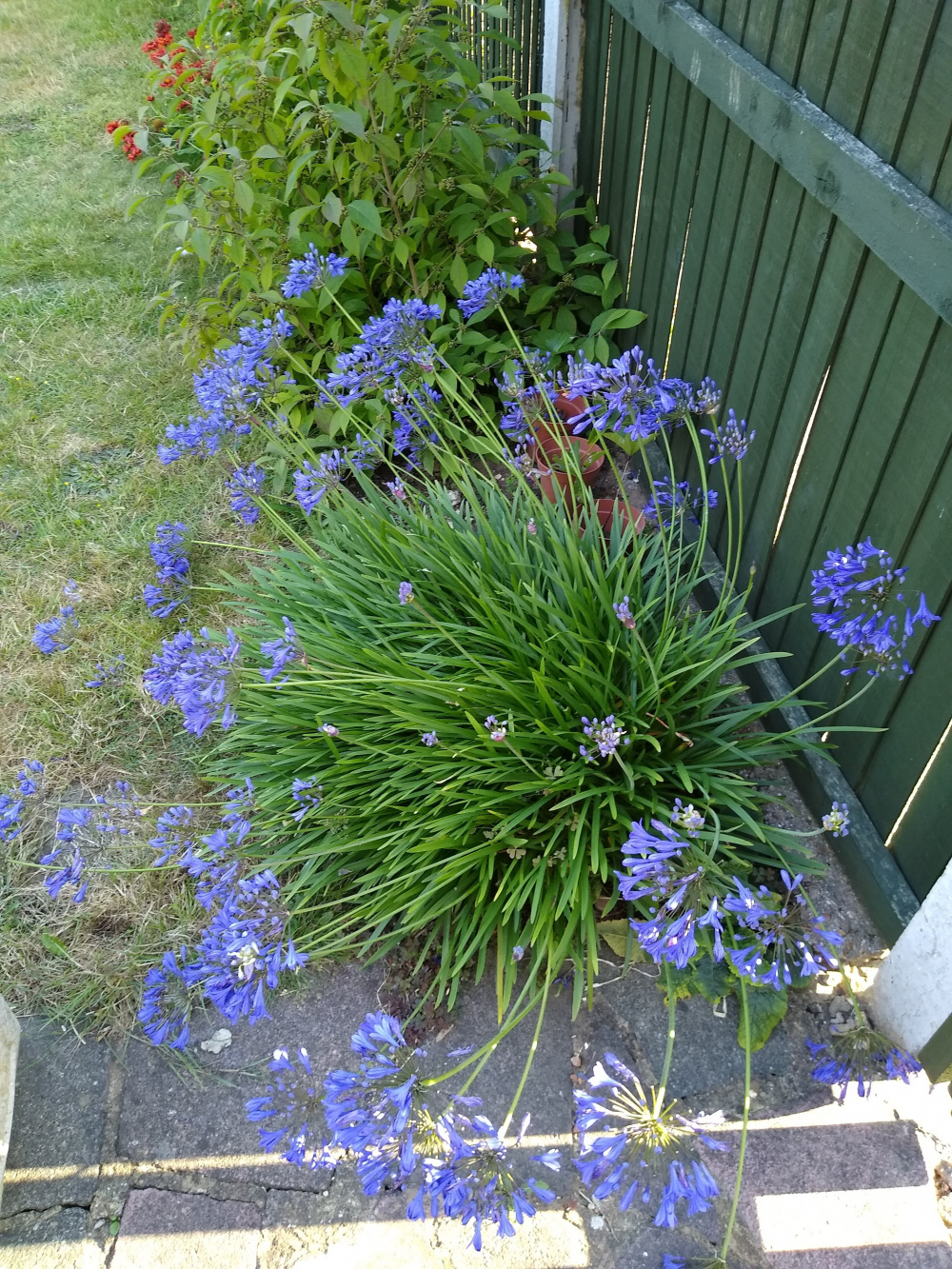 "Hydon Blue", the only one I have left. This is actually two plants in pots by my pond. One thing agapanthus don't like is shade. even if the shade is miles behind, they lean away and the the rain and wind do the rest. In the borders the rhodies and camellias keep encroaching, so I can only grow them in full sun in pots.