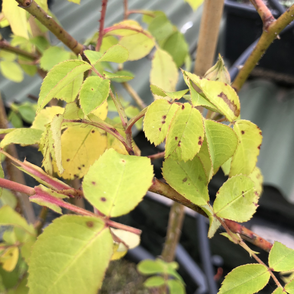 Blackspot is worst with old roses and sick or weak roses. Yours is hungry so the laves lack chlorophyll which helps them feed the plant and are also thin so liable to damage form any floating spores of fungicide or viruses.